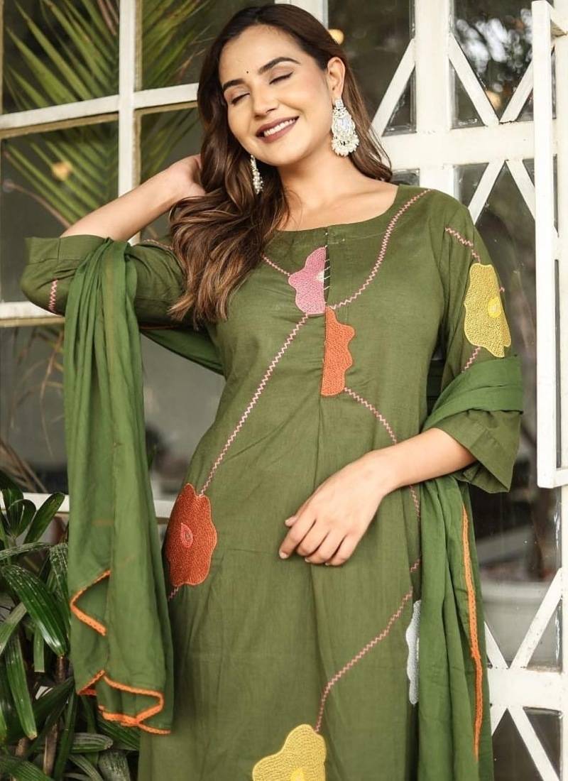 | Product Name | Floral Embroidered Green Round Neck Pure Cotton Kurta Set With Trouser & Dupatta | |