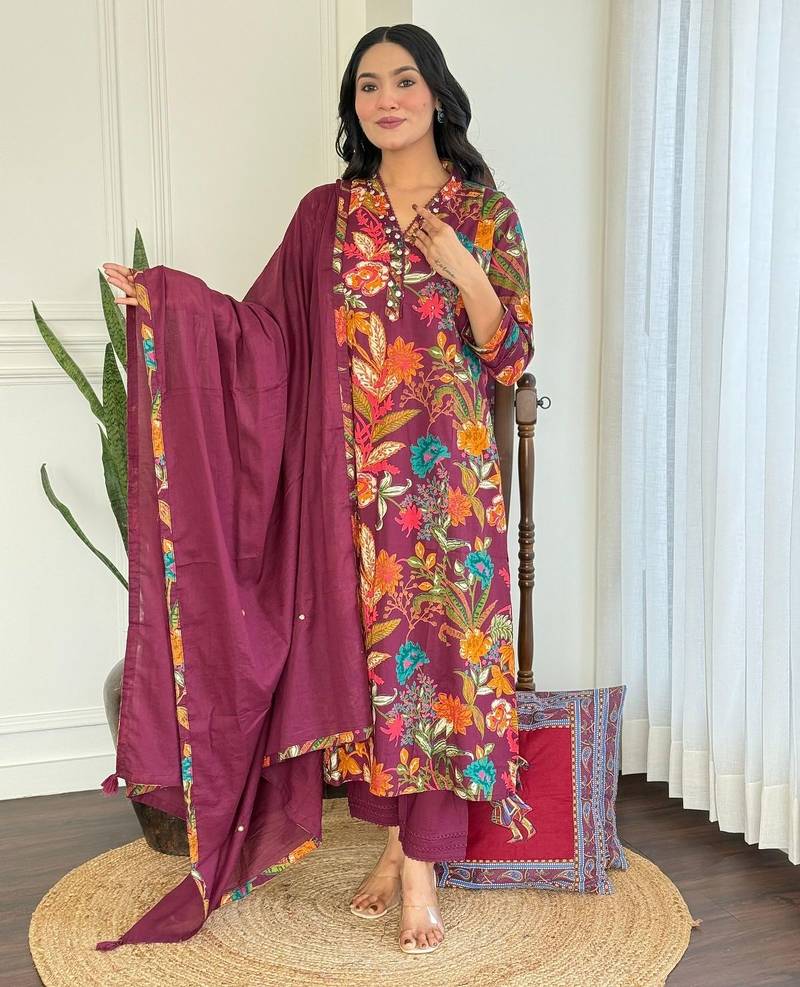 | Product Name | Floral Embroidered Maroon V Neck Pure Cotton Kurta Set With Trouser & Dupatta | |