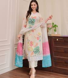 Floral embroidered off-white round neck pure cotton kurta set with trouser & dupatta
