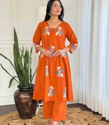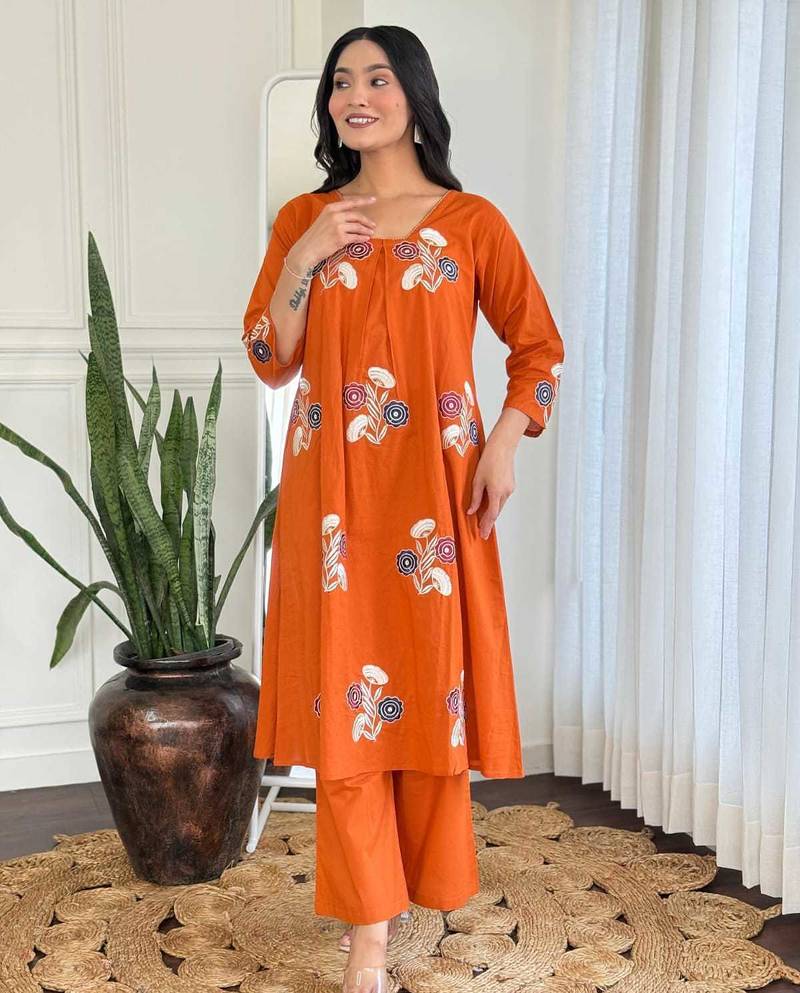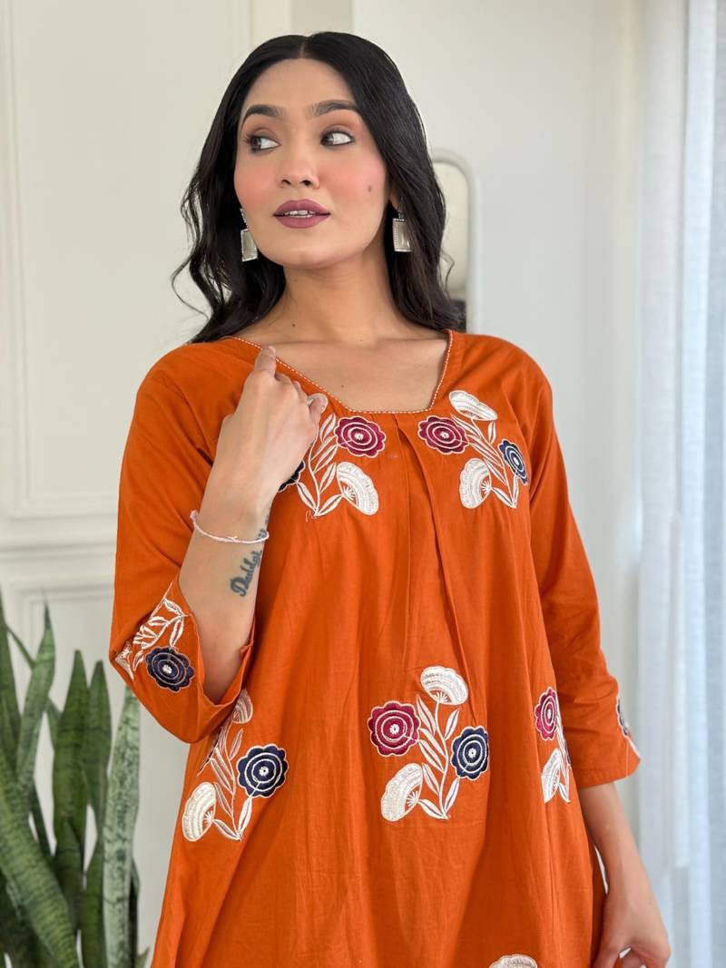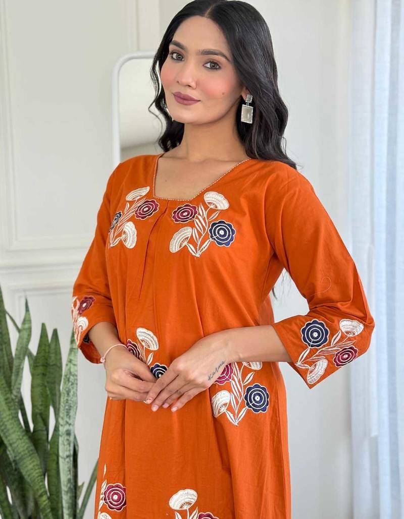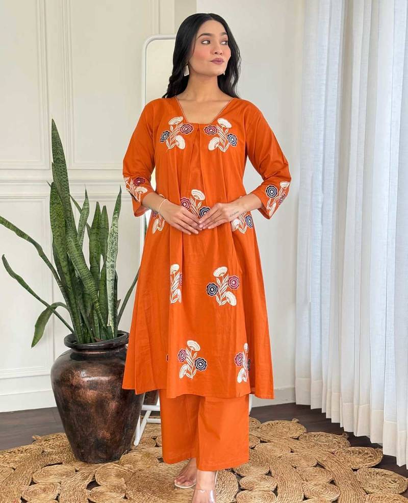 | Product Name | Floral Embroidered Orange V Neck Cotton Kurta Set With Trouser | |