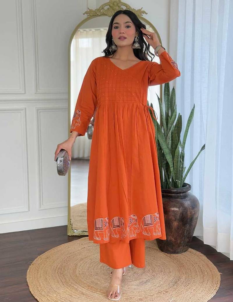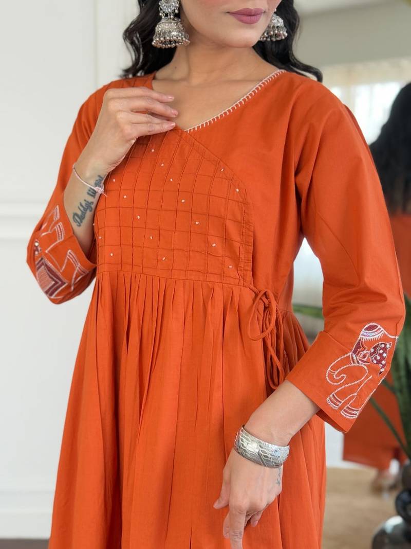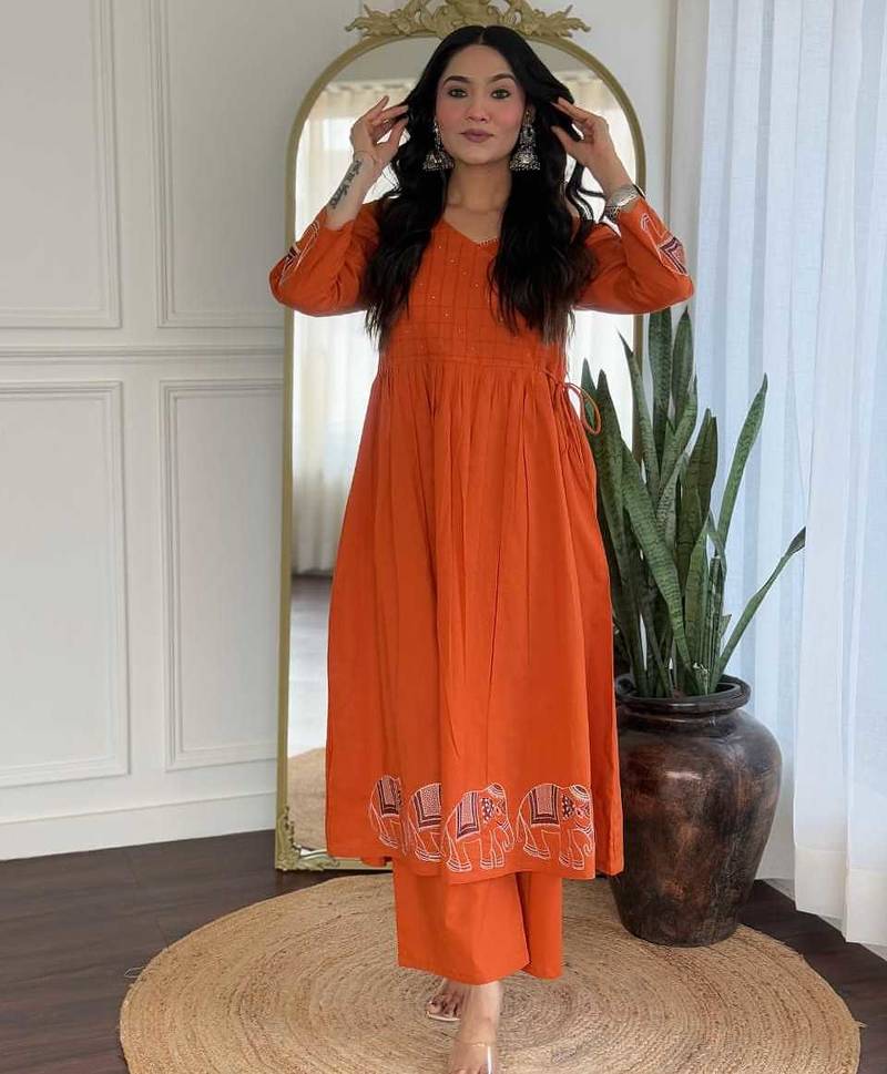 | Product Description | Bring Festive Warmth And Graceful Charm To Your Wardrobe With This Stunning Floral Embroidered Orange Cotton Kurta Set |