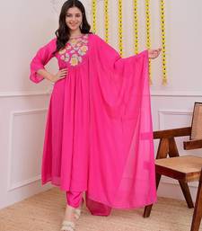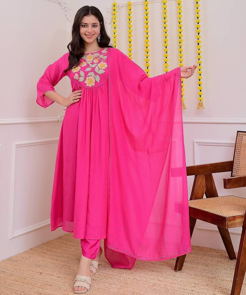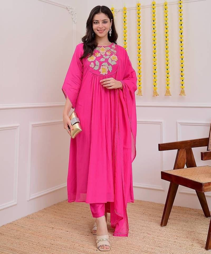 | Product Name | Floral Embroidered Pink Round Neck Cotton Kurta Set With Trouser & Dupatta | |