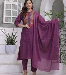 Floral embroidered purple round neck pure cotton kurta with trouser & dupatta set