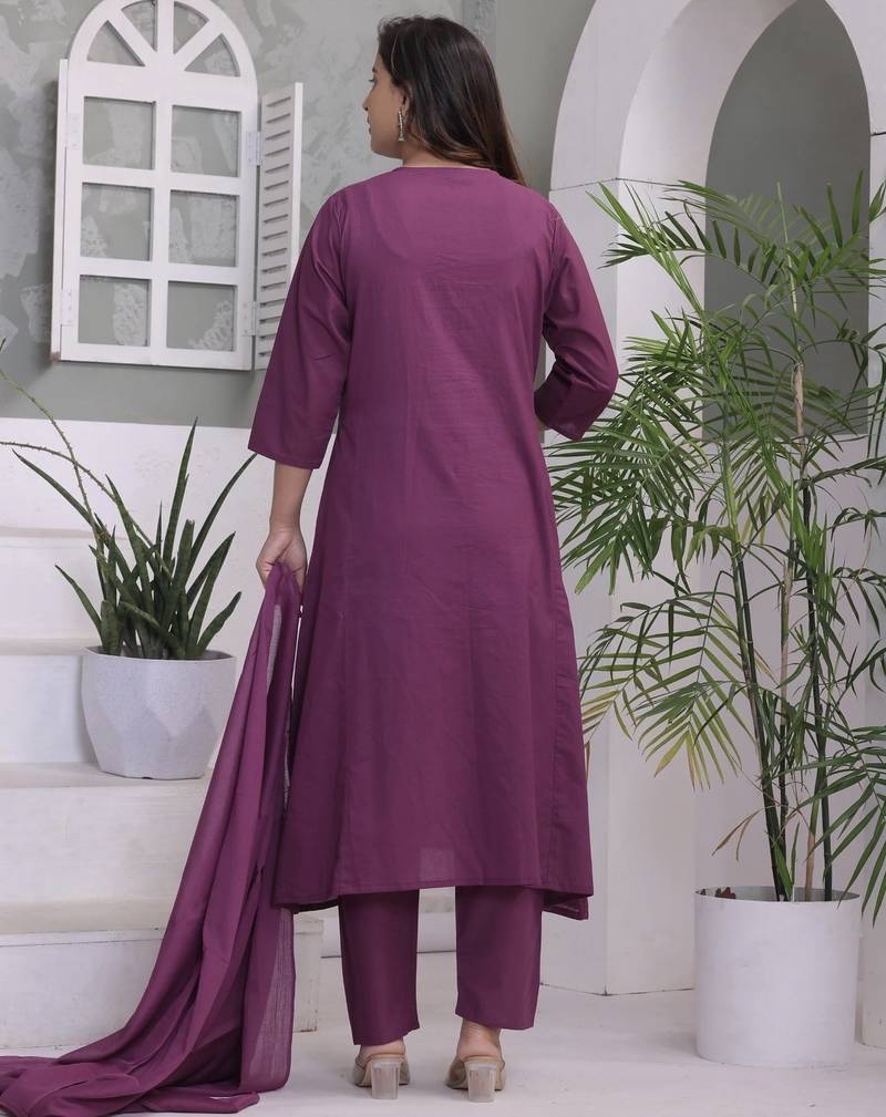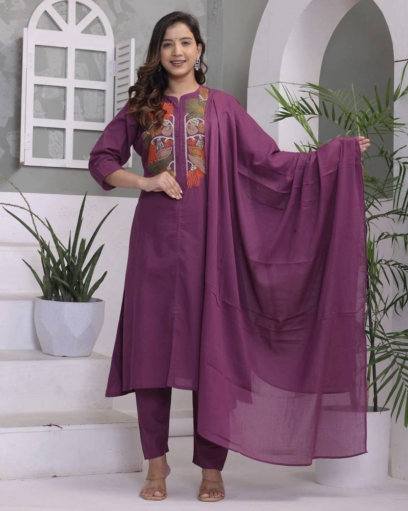 | Product Name | Floral Embroidered Purple Round Neck Pure Cotton Kurta With Trouser & Dupatta Set | |