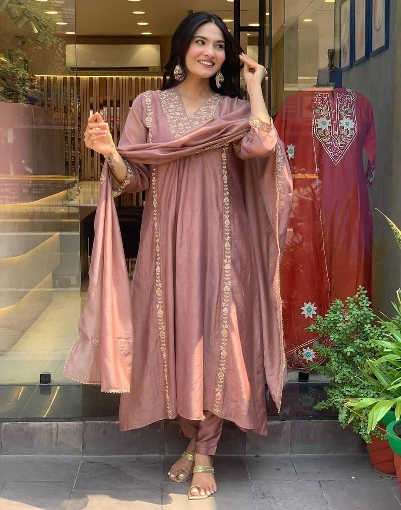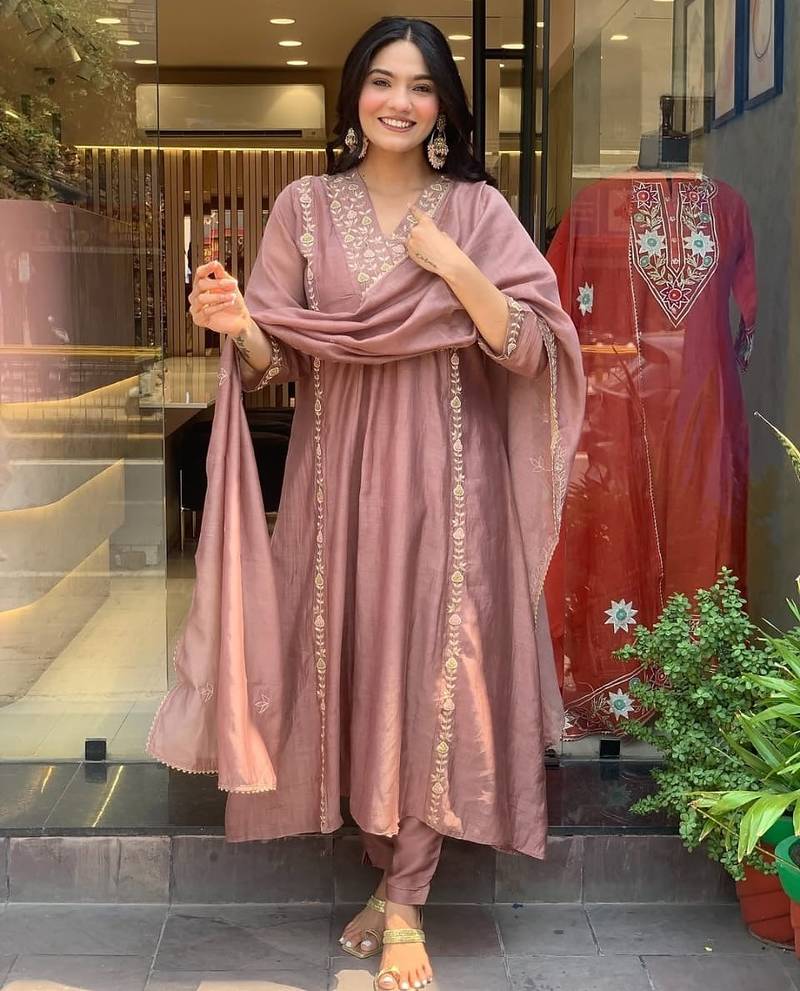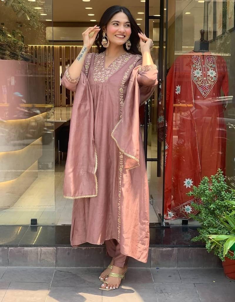 | Product Name | Floral Embroidered Purple V Neck Chanderi Kurta With Trouser With Dupatta | |
