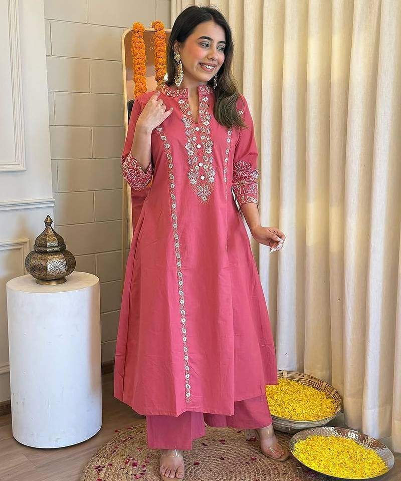 | Product Name | Floral Embroidered Red Round Neck Pure Cotton Kurta Set With Trouser | |