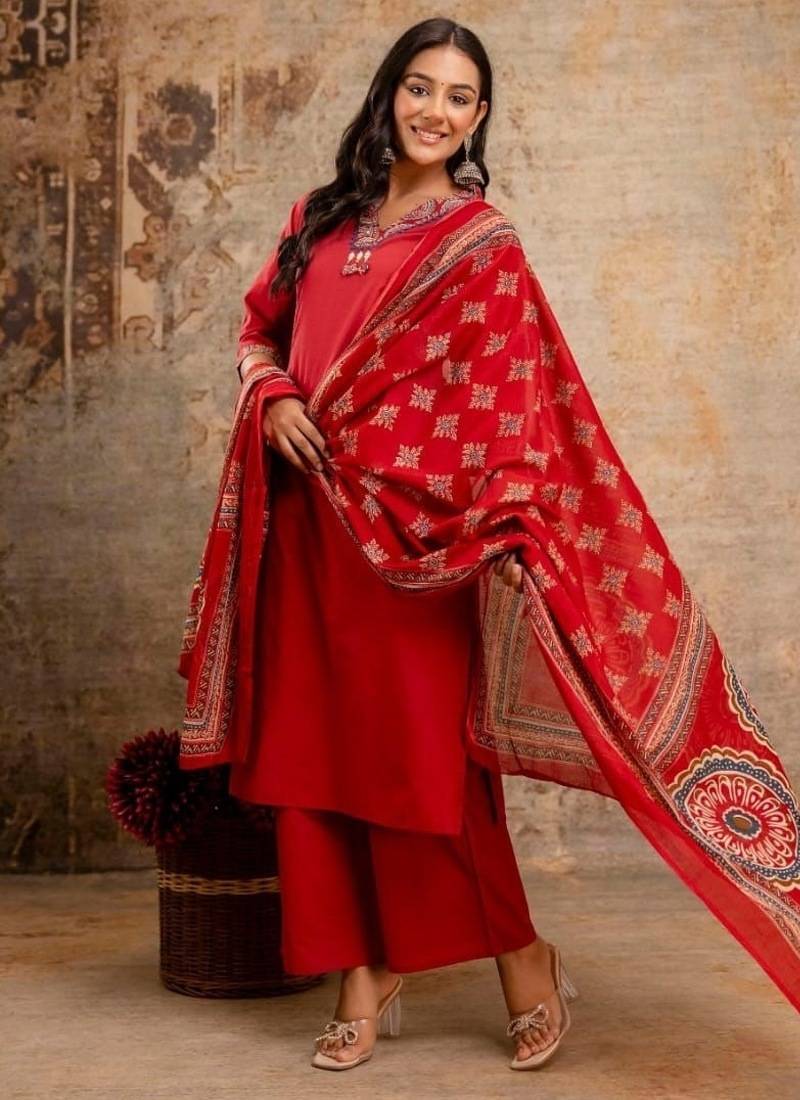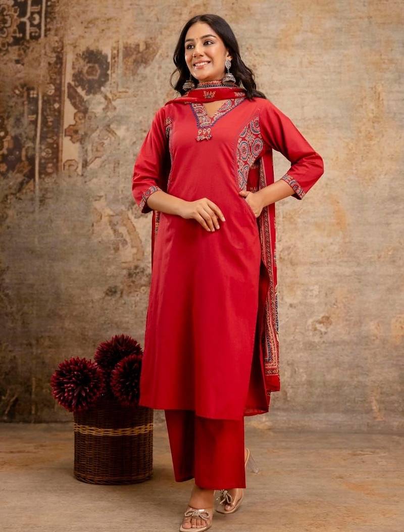 | Product Description | Command Attention In This Stunning Floral Embroidered Red Pure Cotton Kurta, Trouser, And Dupatta Set. The Vibrant Red Hue, Combined With The Flattering V Neck And Breathable Cotton, Makes This Three Piece Ensemble Perfect For Celebratory And Special Occasions.Key Features Of The Complete Set:Premium Pure Cotton Comfort: The Kurta And Trousers Are Made From 100% Pure Cotton, Ensuring Superior Breathability And Comfort Even During Long Hours Of Wear.Striking Red Color: The Rich, Festive Red Shade Is A Classic Choice For Celebrations, Symbolizing Energy And Elegance.Flattering V Neckline: The Stylish V Neck Modernizes The Silhouette, Providing An Elongating And Universally Flattering Fit.Artisan Floral Embroidery: The Kurta Is Adorned With Beautiful Floral Embroidery, Typically Accentuating The V Neck And Upper Body, Adding A Refined, Handcrafted Appeal.Coordinating Dupatta: A Matching Or Complementary Dupatta (Often In Cotton, Chanderi, Or A Cotton Blend) Completes The Traditional Look, Offering Multiple Styling Options.Ready To Wear Ensemble: This Set Includes The Embroidered Kurta, Comfortable Straight Cut Trousers, And The Dupatta.Sizing: Available In Sizes From Medium (M) To Double Extra Large (Xxl).Component Detail Kurta & Trouser Pure Cotton Dupatta Cotton Or Cotton Blend (E.G., Kota Doria For A Lighter Feel)Color Red Neckline V Neck Style3 Piece Set With Floral Embroidery |