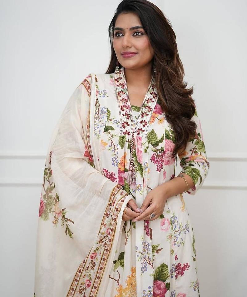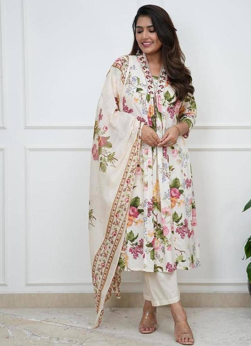 Product Name Floral Embroidered White V Neck Pure Cotton Kurta With Trouser & Dupatta