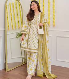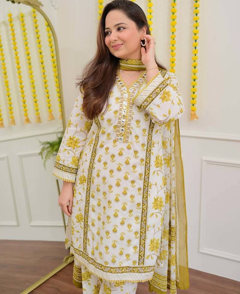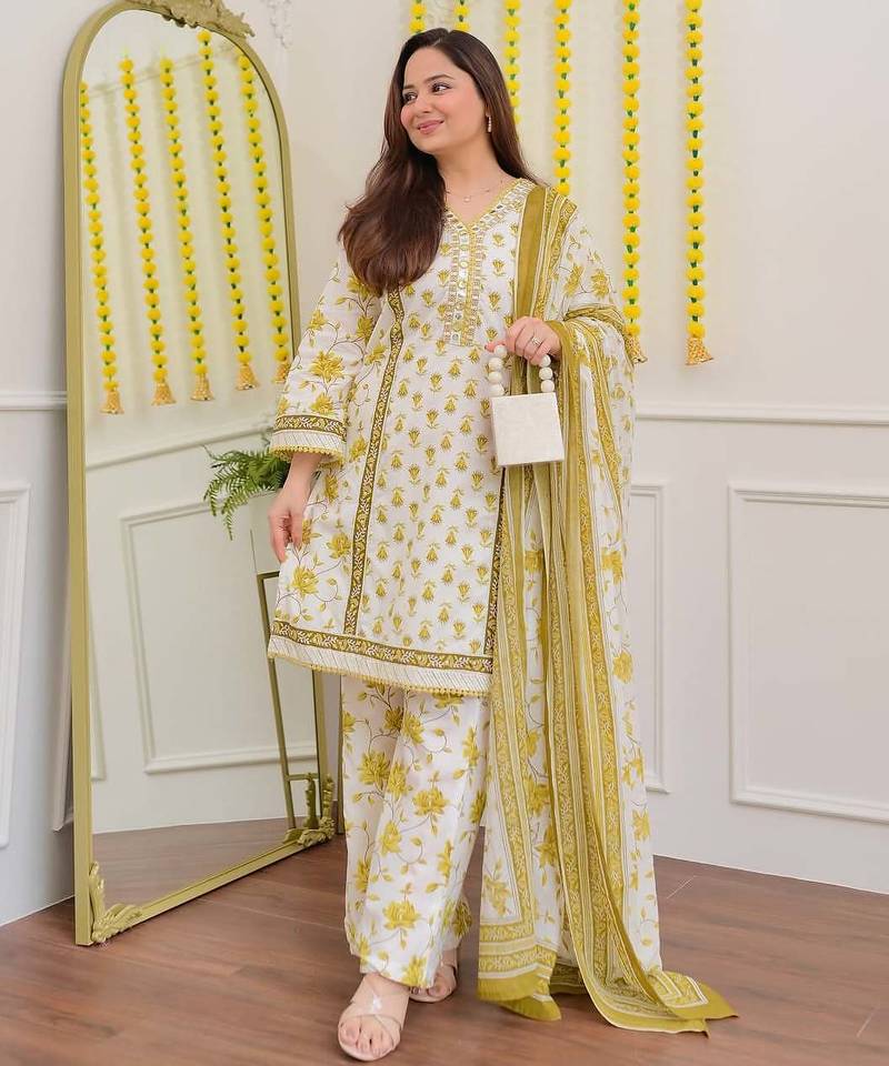 | Product Name | Floral Embroidered Yellow V Neck Cotton Kurta Set With Trouser & Dupatta | |