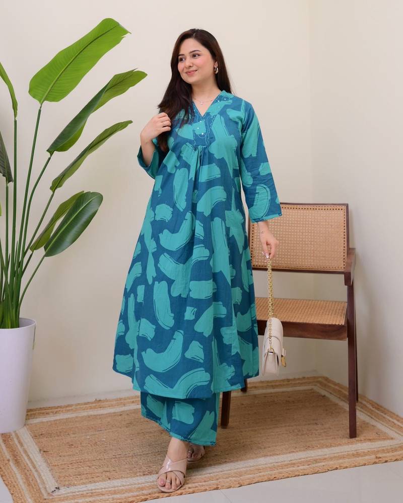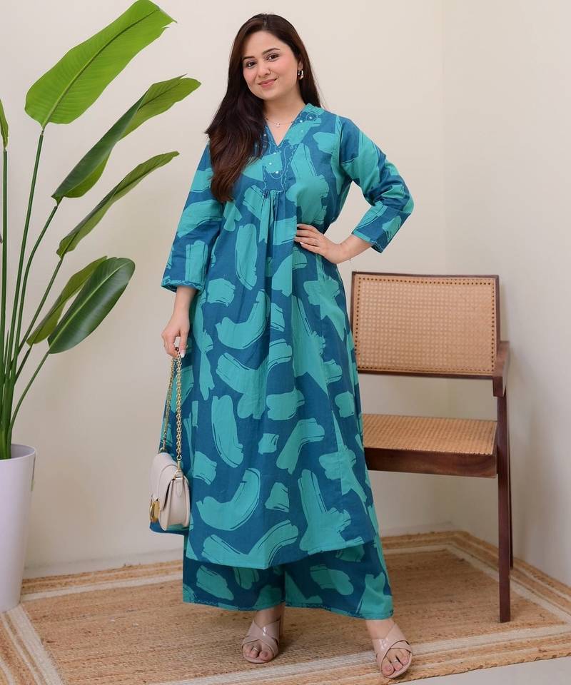Color: A Serene And Versatile Shade Of Blue, Reminiscent Of Cool Water. Design: Features A Flattering V Neck Neckline That Adds An Elegant Touch. Detailing: Adorned With A Charming Floral Print Pattern Throughout The Kurta, Giving It A Fresh And Lively Aesthetic. Set Includes: A Comfortable, Printed Pure Cotton Kurta And A Coordinating Pair Of Trousers. Sizing: Available In A Wide And Inclusive Size Range From S To 3 Xl. Styling & Occasions