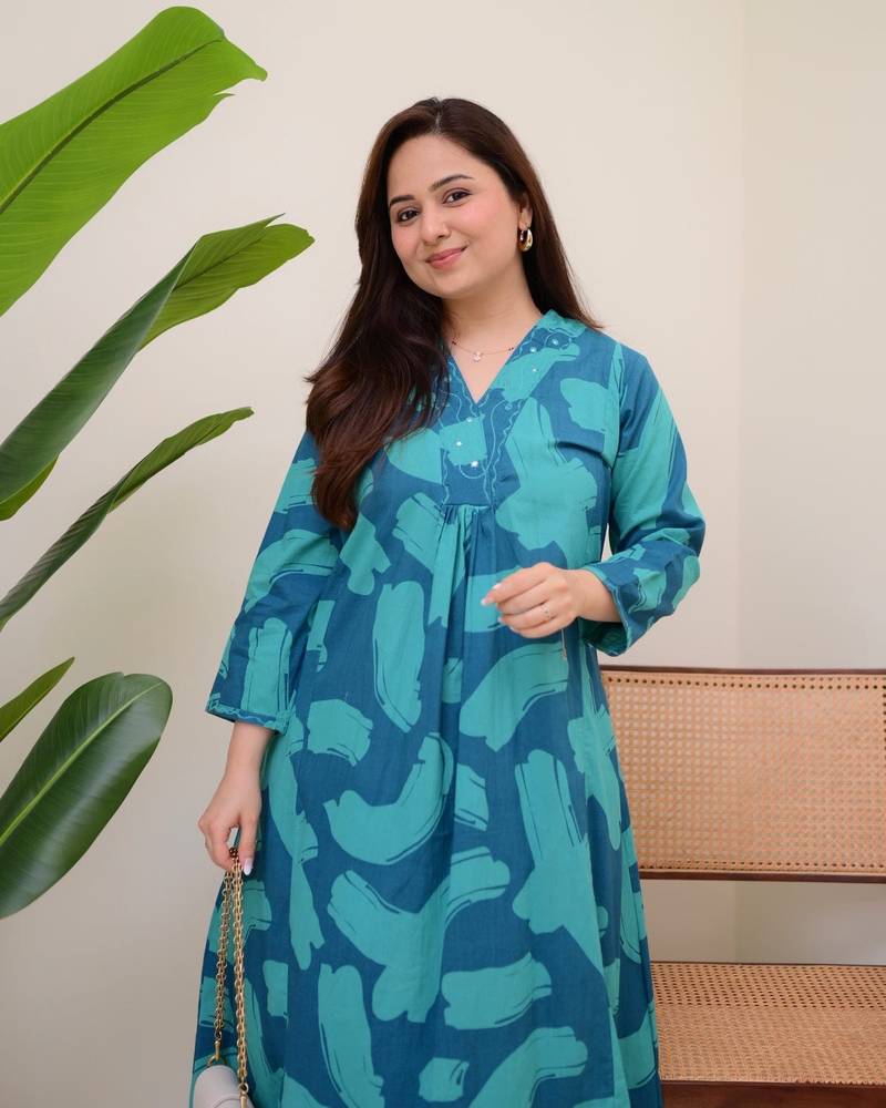 | Product Name | Floral Printed Blue V Neck Pure Cotton Kurta With Trouser | |