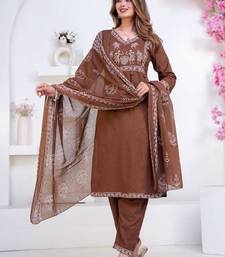 Floral printed brown v neck pure cotton kurta set with trouser & dupatta