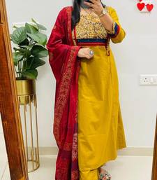 Floral printed dark-yellow round neck cotton floral kurta with trousers & dupatta set