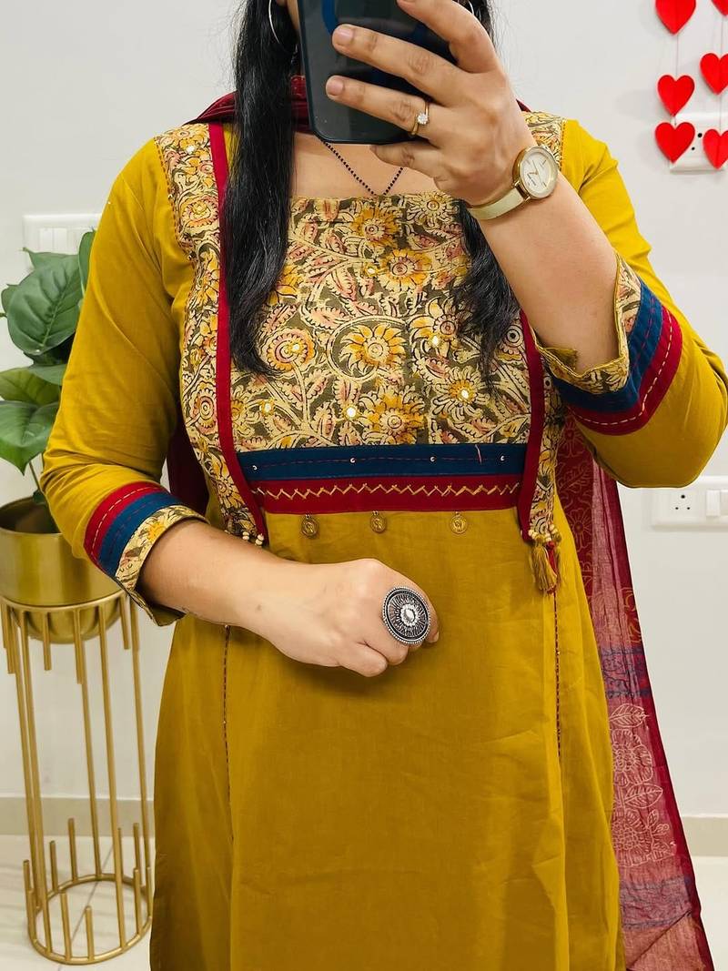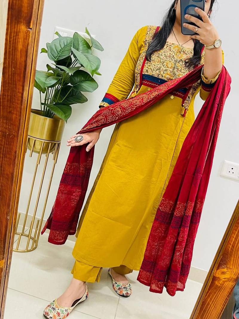 | Product Name | Floral Printed Dark Yellow Round Neck Cotton Floral Kurta With Trousers & Dupatta Set | |