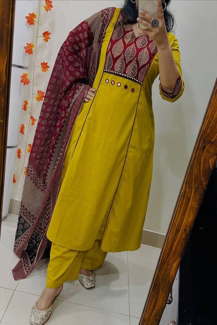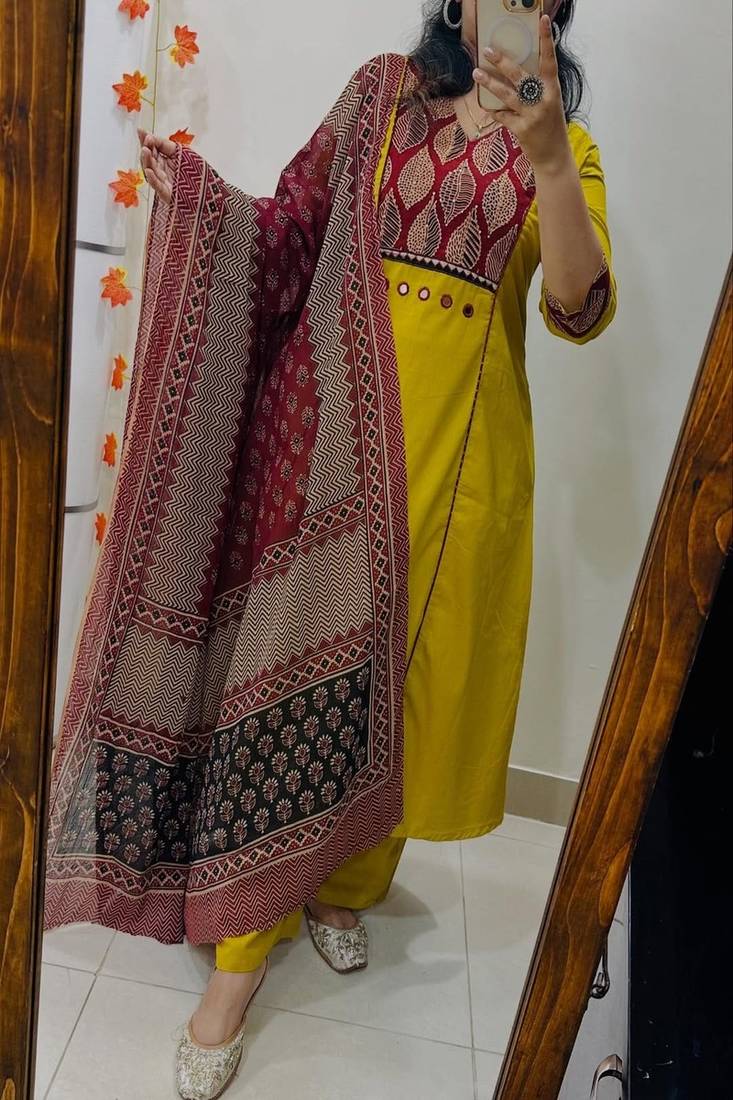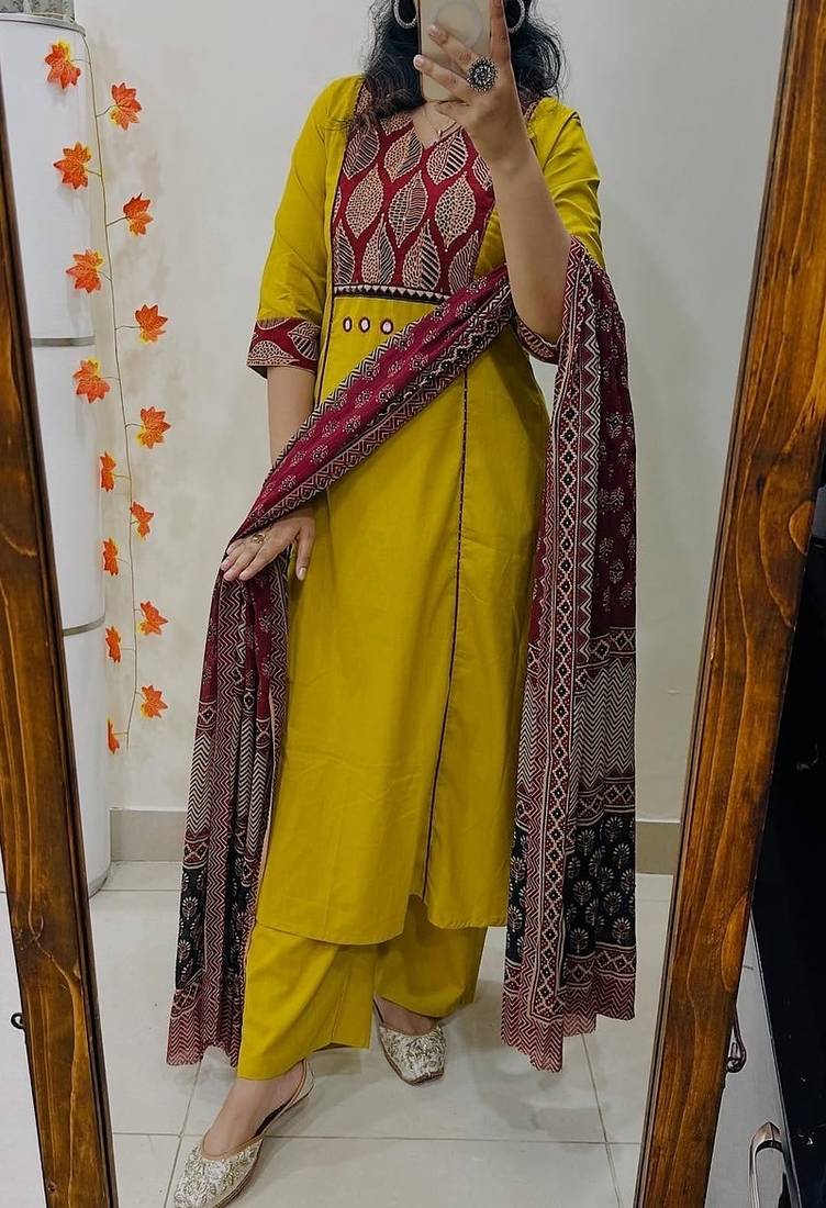 | Product Description | Refresh Your Ethnic Wardrobe With This Stylish Floral Printed V Neck Pure Cotton Kurta Trouser & Dupatta Set, Designed For Comfort And Effortless Elegance. Made From Soft And Breathable Pure Cotton Fabric, This Kurta Set Ensures A Relaxed Fit Perfect For Everyday Wear. The Beautifully Crafted Floral Print Adds A Fresh, Feminine Appeal, While The Flattering V Neck Design Enhances The Overall Silhouette. Paired With A Matching Cotton Trouser And A Lightweight Dupatta, This Versatile 3 Piece Set Is Ideal For Casual Outings, Office Wear, Festive Gatherings, And Summer Occasions. Style It With Minimal Accessories For A Graceful Ethnic Look. ✨ Key Features (Bullet Points) Pure Cotton Fabric – Soft, Breathable, And Skin Friendly For All Day Comfort Elegant Floral Print – Fresh And Vibrant Design For A Timeless Ethnic Look Flattering V Neck Kurta – Enhances Neckline And Adds Modern Appeal 3 Piece Coordinated Set – Kurta, Trouser, And Matching Dupatta Included Perfect For Multiple Occasions – Suitable For Daily Wear, Office, Festive, And Casual Outings |