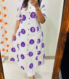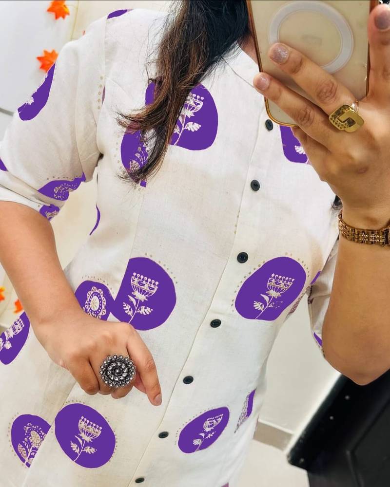 Step Into Effortless Elegance With This White Base Purple Floral Printed Pure Cotton Kurta Set, Designed For Women Who Prefer Soft Comfort With Bold Design. The Pure White Cotton Fabric Is Adorned With Striking Purple Floral Circle Prints That Make The Outfit Stand Out Beautifully. The Button Down Front And Classic Round Neckline Add A Touch Of Modern Simplicity, Paired With A Comfortable White Trouser For A Complete And Stylish Look.