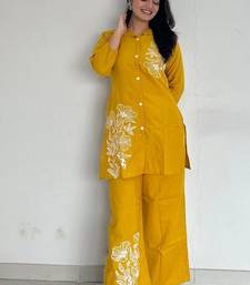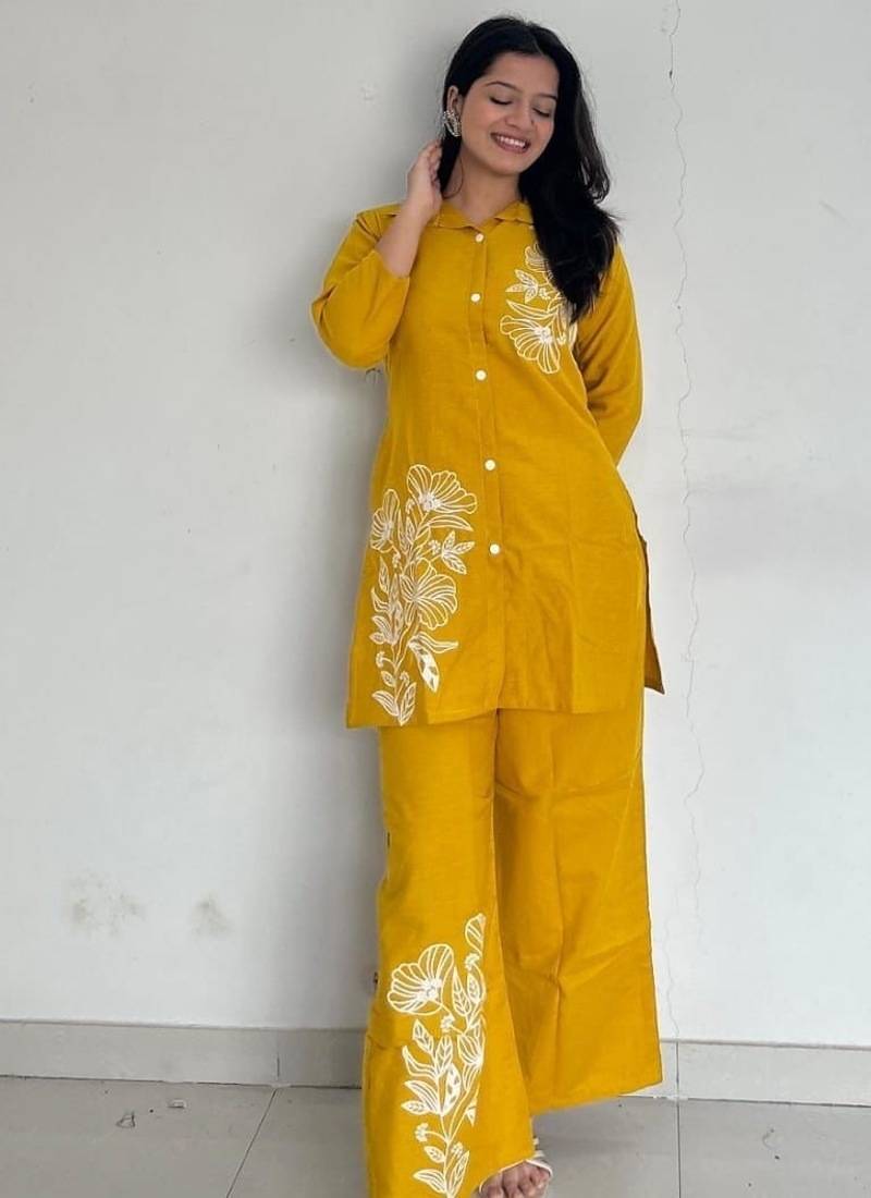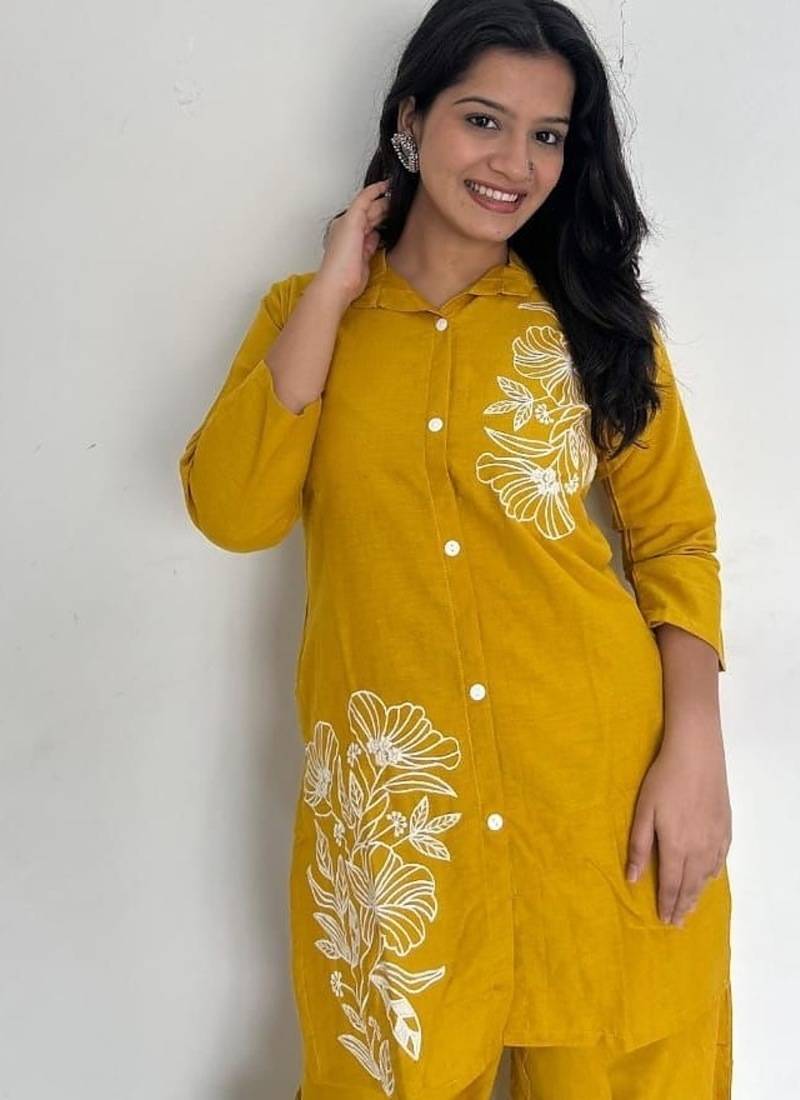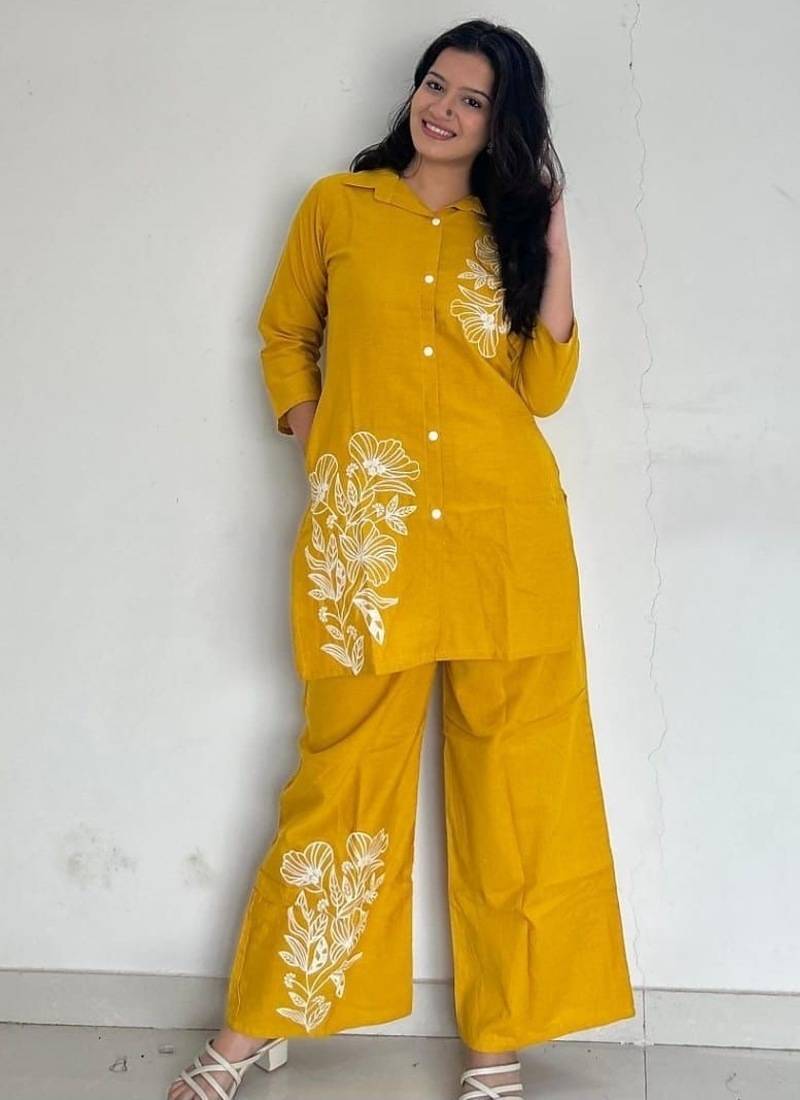 | Product Description | Brighten Up Your Everyday Dressing With This Floral Printed Yellow Pure Cotton Co Ord Set, Designed To Give You Chic Comfort With A Modern Ethnic Fusion Feel. Made From Soft Breathable Cotton, This Stylish 2 Piece Coord Set Includes A Button Down Round Neck Shirt Style Kurta Top With Floral Motif Detailing & Matching Wide Leg Trousers – Offering A Complete Ready To Wear Look. The Refreshing Yellow Shade Adds A Lively, Youthful Vibe While The White Floral Print Adds A Beautifully Minimal Designer Finish. Ideal For Office Casuals, College Looks, Travel, Brunch Plans, Day Outings & Effortless Everyday Styling. Product Features / Highlights: Fabric: 100% Pure Cotton Colour: Yellow Neckline: Round Neck / Shirt Collar Inspired Sleeves: 3/4th Sleeves Top Style: Button Front Stylish Straight Kurta Bottom Style: Wide Leg Straight Trousers Print Type: Floral Printed Motif Set Includes: Top + Bottom Co Ord Set Fit: Regular Comfortable Fit Occasion: Daily Wear | Office Wear | Travel | Brunch | Casual Outings | Summer Styling Available Sizes: M | L | Xl | Xxl | 3 Xl Why You’ll Love This Set: