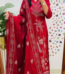 Red embroidered v neck pure cotton kurta trouser dupatta set