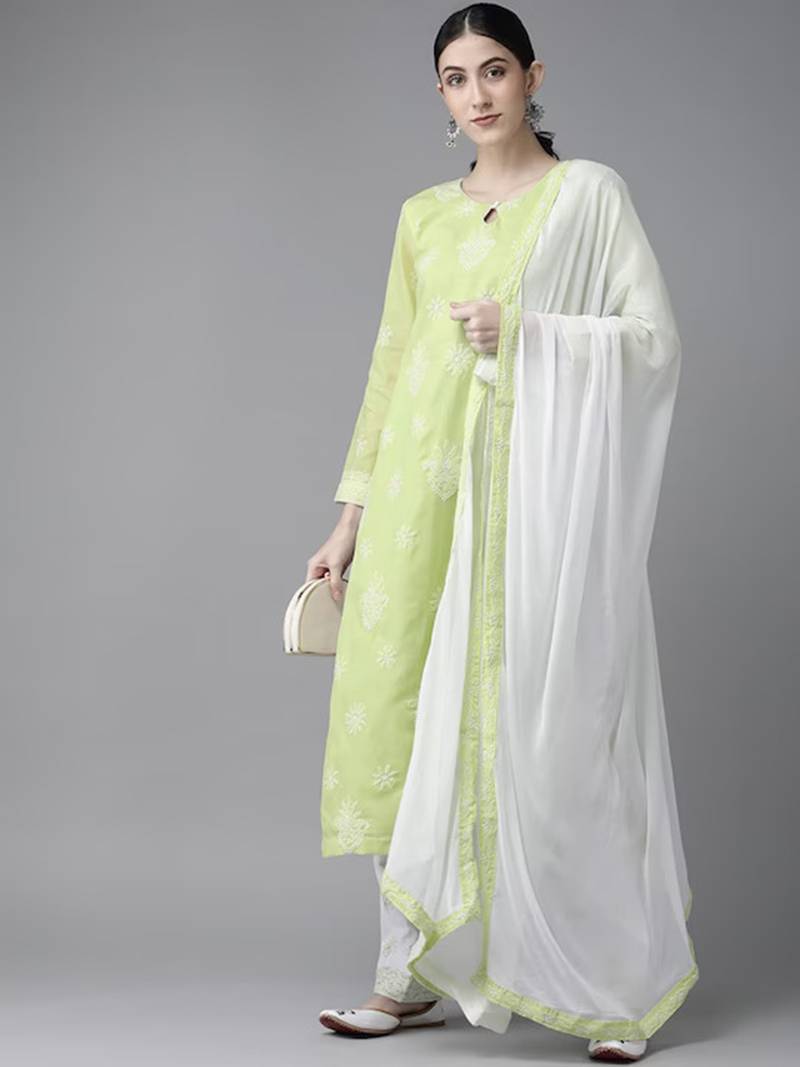 Ada hand embroidered green::White cotton lucknowi chikankari women unstitched suit piece - a211201
