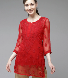 Ada women hand crafted red georgette lucknowi chikankari indian kurti with slip - a911140