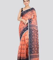 Pinkloom women's peach handWoven soft cotton jamdani-sarees without blouse piece