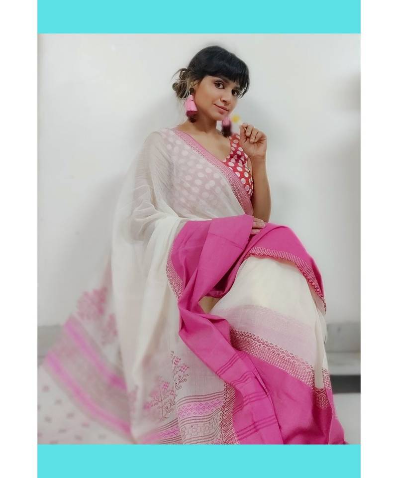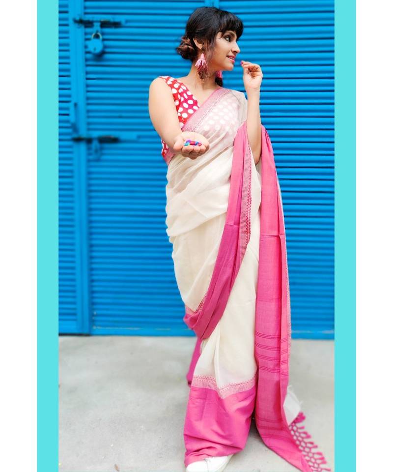 Define elegance with comfort in this khadi cotton saree, breezy white with contrast pink pallu