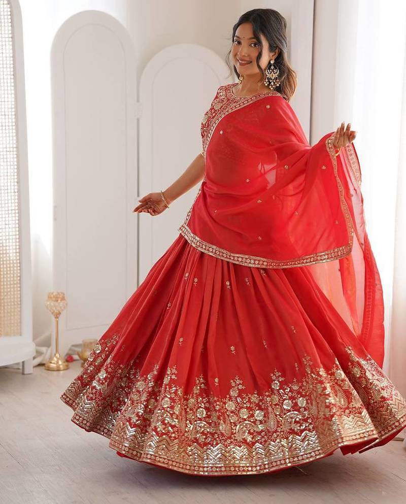 | Product Description | Make A Statement At Wedding Celebrations With This Red Shimmer Lehenga Choli, Designed With Rich Detailing, A Graceful Flare, And A Well Balanced Traditional Look. Crafted From Shimmer Fabric, The Lehenga Offers A Soft Shine With A Fluid And Structured Fall That Enhances The Overall Silhouette. The Red Tone Creates A Warm And Festive Base, While The Detailed Embroidery Along The Lehenga Hem And Choli Adds Depth And Traditional Charm Without Making The Design Look Heavy. The Choli Is Designed With Matching Embroidery That Complements The Lehenga, Creating A Coordinated And Refined Look. The Dupatta With Border Detailing Adds An Elegant Finishing Touch And Completes The Outfit Beautifully. Ideal For Weddings, Receptions, And Festive Functions, This Lehenga Choli Pairs Well With Statement Jewellery And Heels For A Complete And Well Styled Traditional Appearance. |