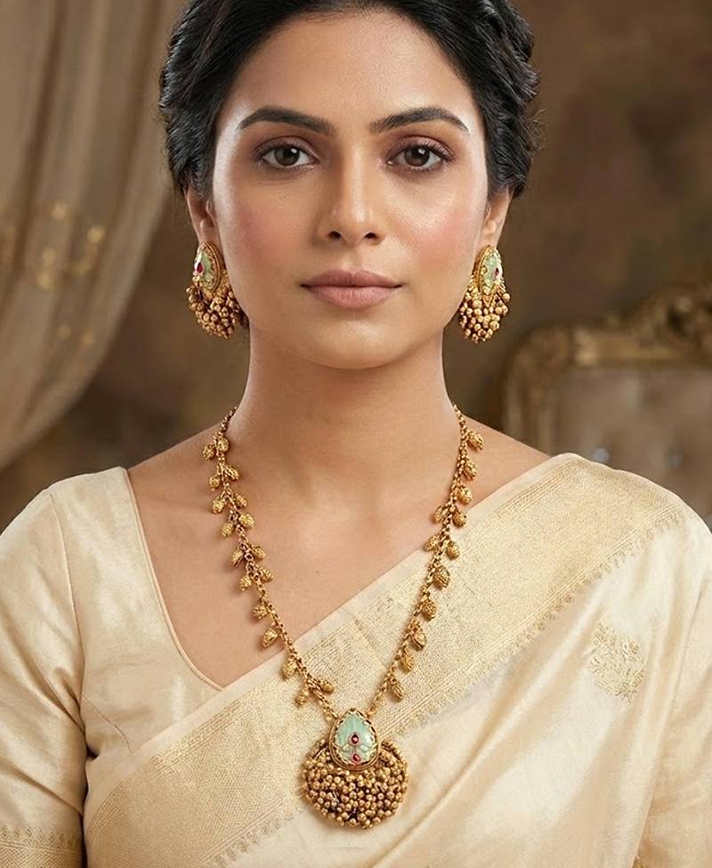 | Product Description | The Pendant Necklace Showcases A Rich Antique Gold Finish, Giving It A Warm, Heritage Look With A Slightly Aged, Vintage Charm Rather Than A Bright New Gold Shine. This Textured Finish Highlights The Intricate Carvings And Motifs, Bringing Out The Depth And Artistry. The Design Motifs Draw Inspiration From Classic Temple Jewellery — Often Featuring Traditional Elements Like Floral Patterns, Divine Motifs, Or Symbolic Art That Reflect Cultural And Religious Heritage. |