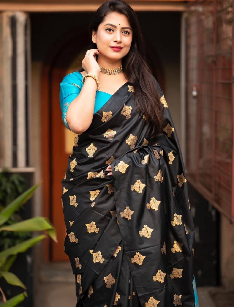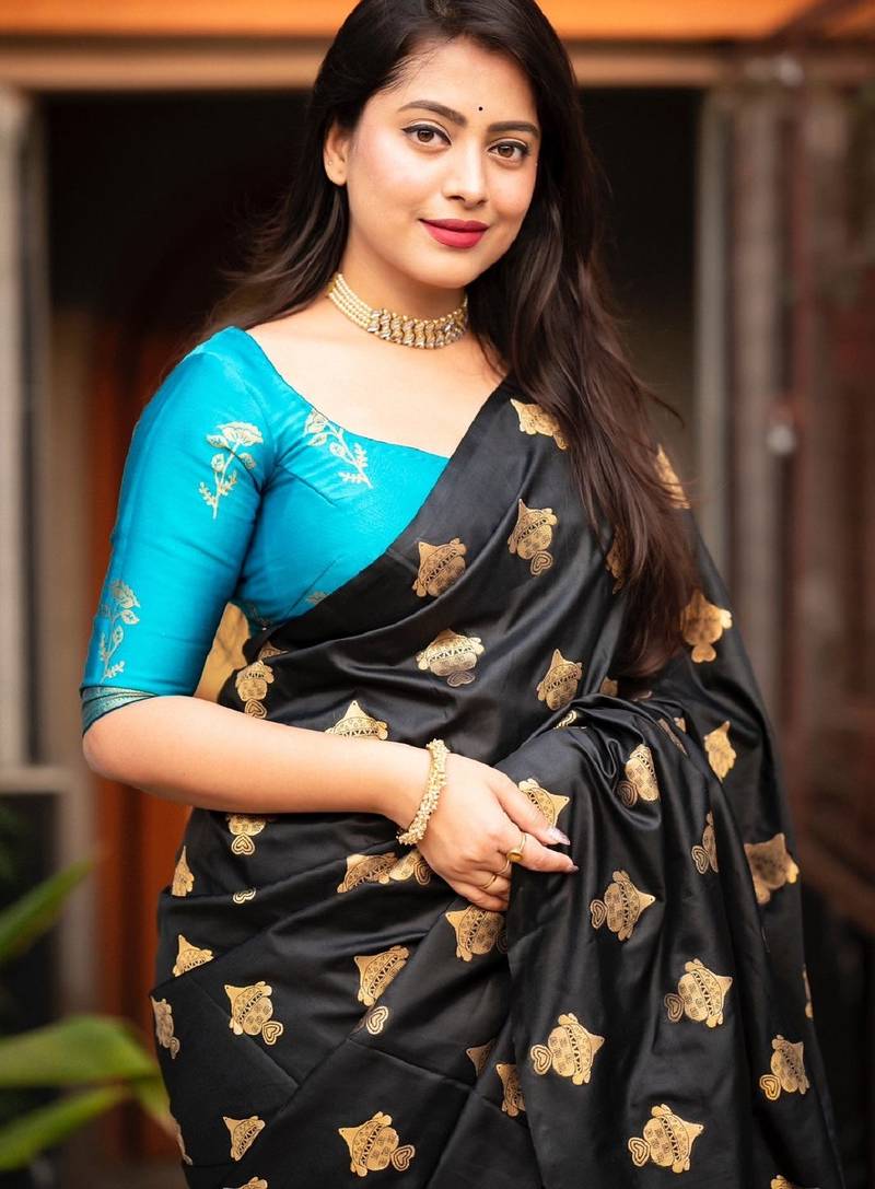 Black rama soft silk blend banarasi jacuard work designer party wear saree with unstitched blouse piece