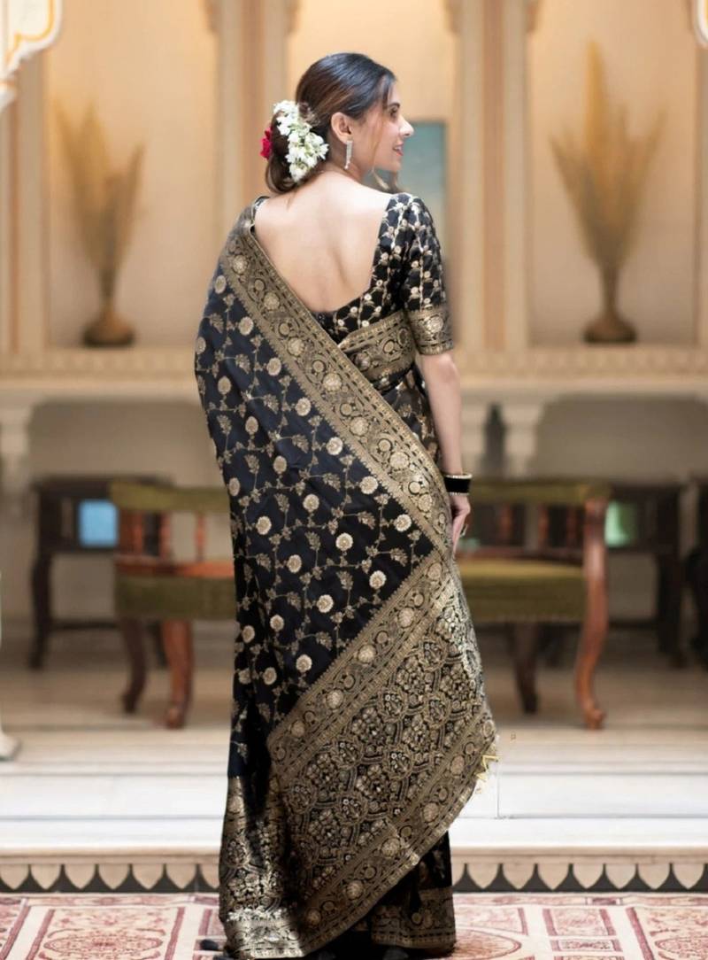 black  soft art silk banarasi jacuard work designer party wear saree with unstitched blouse piece