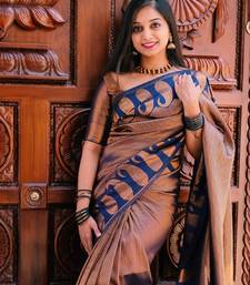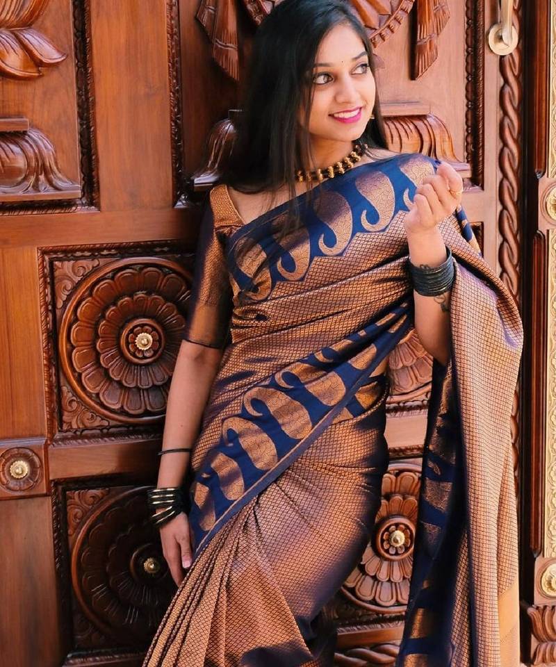 Blue copper soft silk blend banarasi jacuard work designer party wear saree with unstitched blouse piece