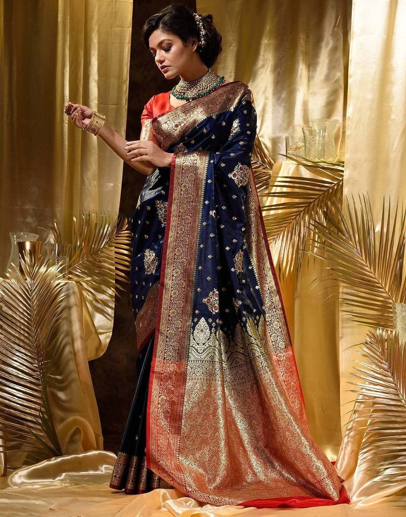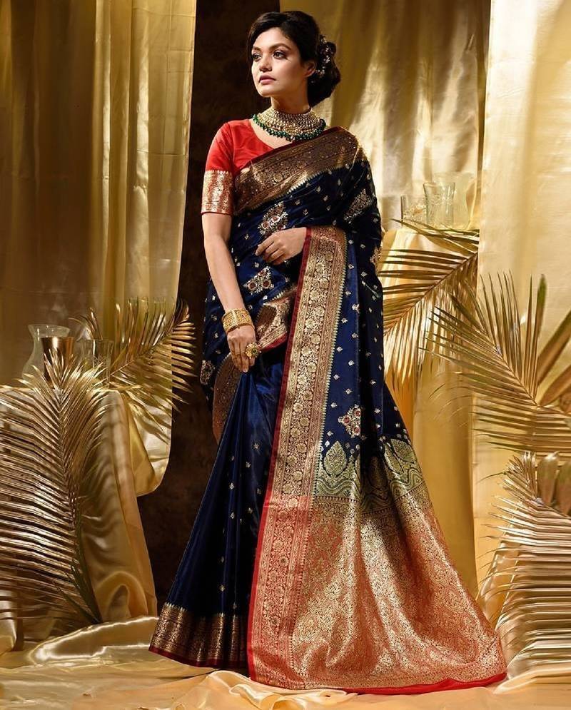 Blue red soft silk blend banarasi jacuard work designer party wear saree with unstitched blouse piece