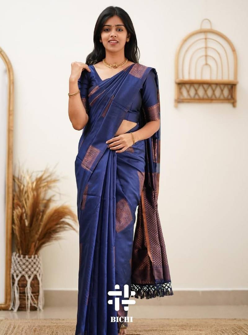 Blue soft silk blend banarasi jacuard work designer party wear saree with unstitched blouse piece