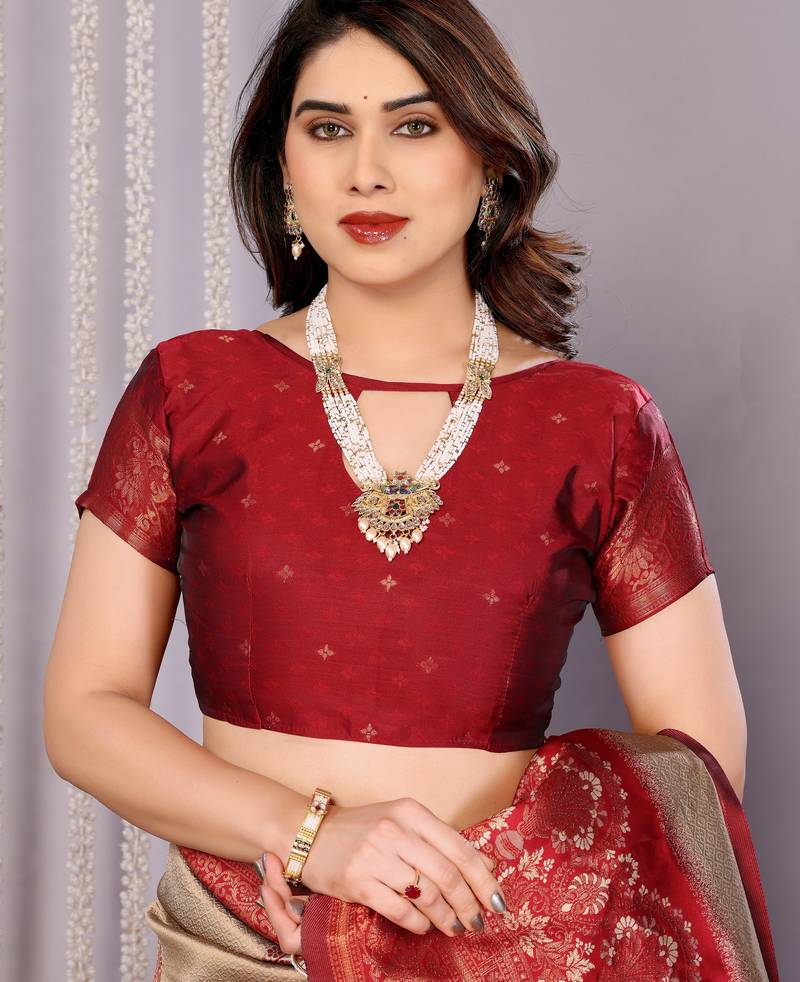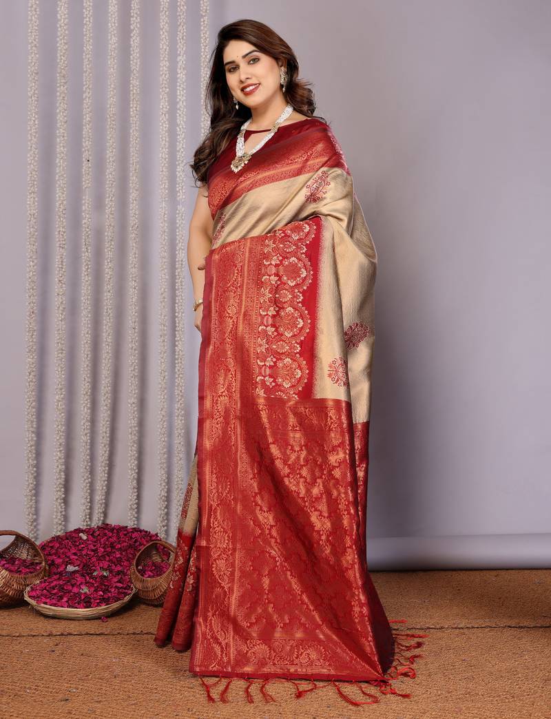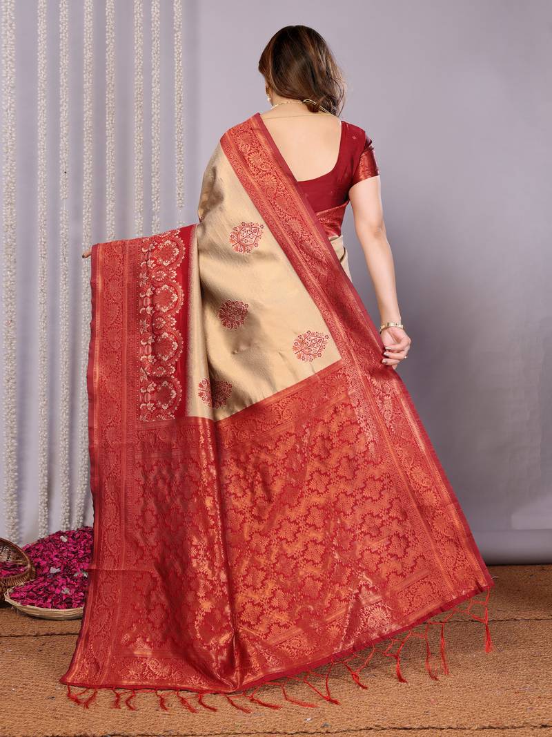 Cream maroon soft art silk blend banarasi jacuard work designer party wear saree with unstitched blouse piece