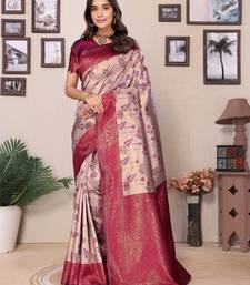 Cream wine soft silk blend banarasi jacuard work designer party wear saree with unstitched blouse piece