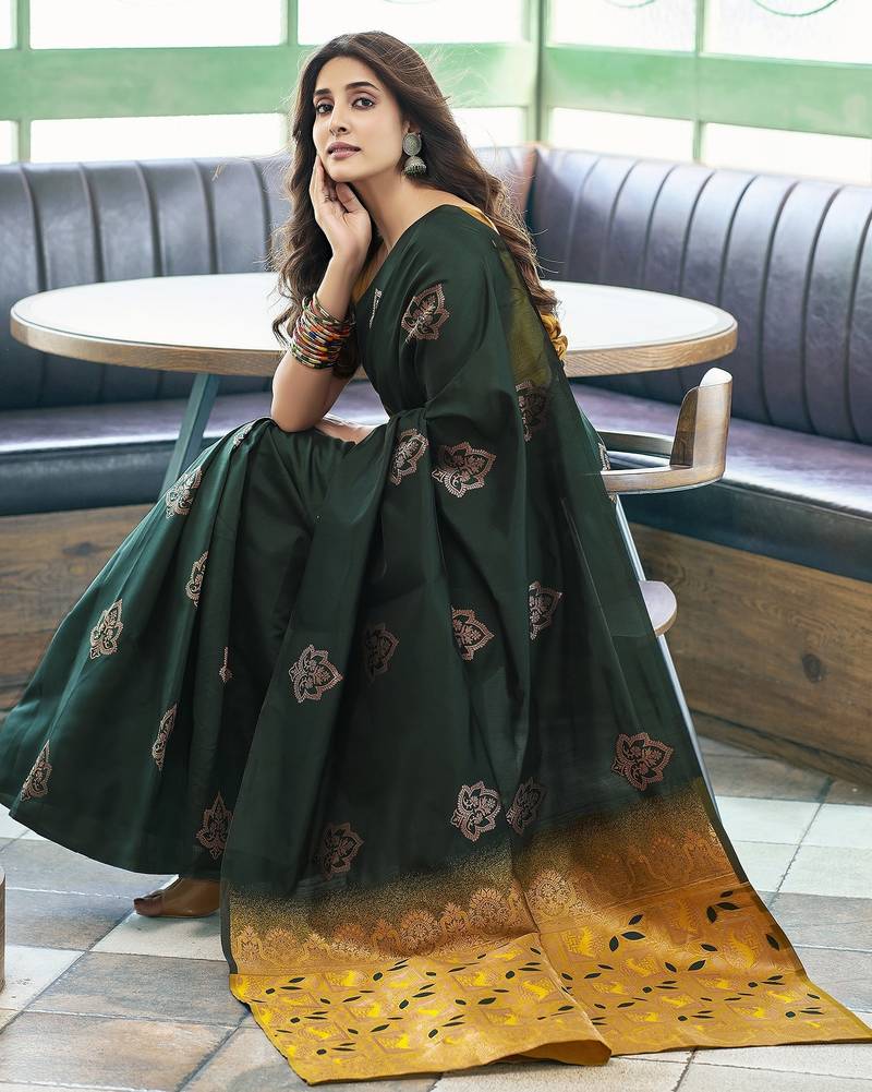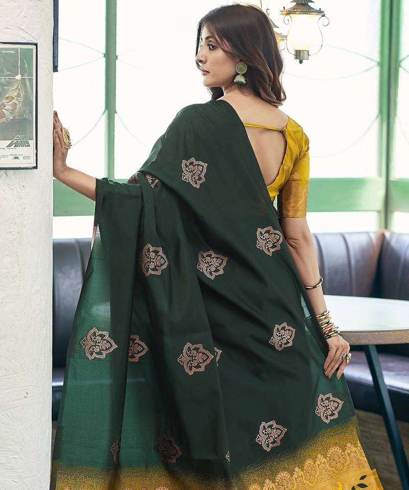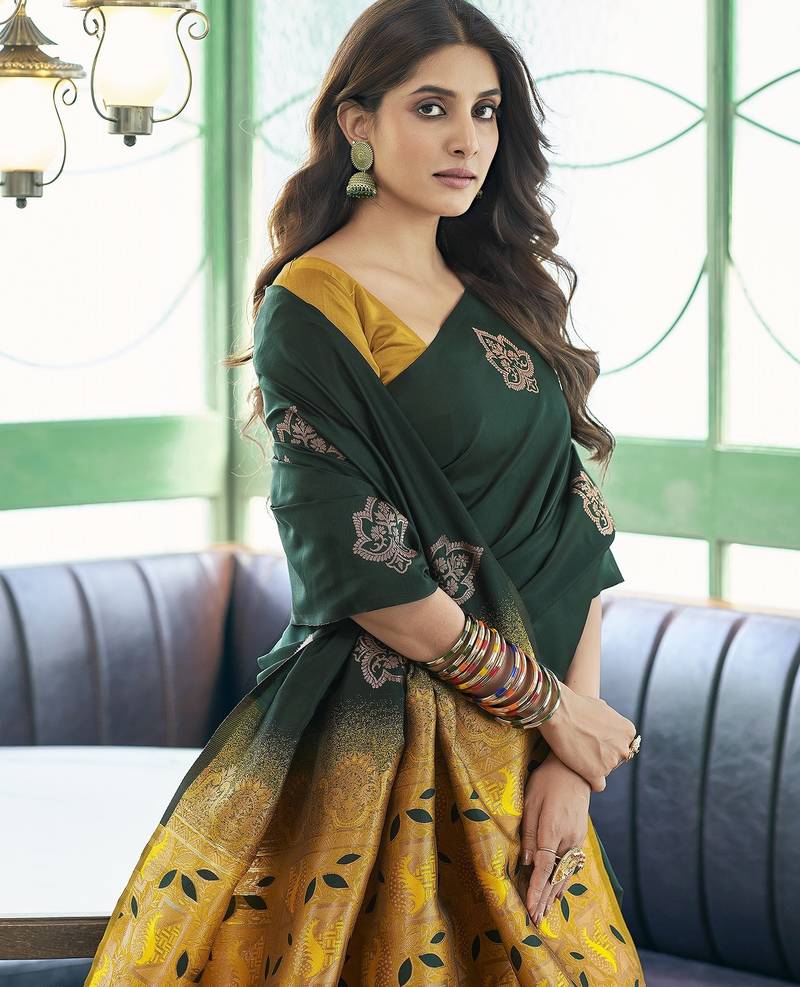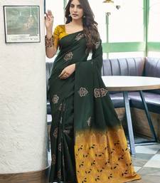 Dark green yellow soft silk blend banarasi jacuard work designer party wear saree with unstitched blouse piece