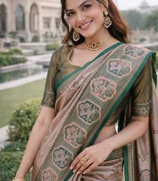 🌸 Design Details The Saree Features A Soft Peach Base Adorned With Delicate Woven Motifs That Enhance Its Royal Charm. The Rich Wine Colored Border And Pallu Are Intricately Designed With Traditional Banarasi Zari Weaving, Adding Depth, Contrast, And Grandeur To The Overall Look. The Ornate Zari Work Reflects Classic Heritage Craftsmanship, Making This Saree Ideal For Festive Occasions, Weddings, Cultural Events, And Celebrations. 👗 Blouse Details