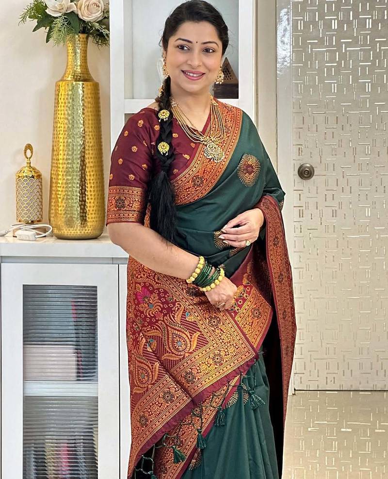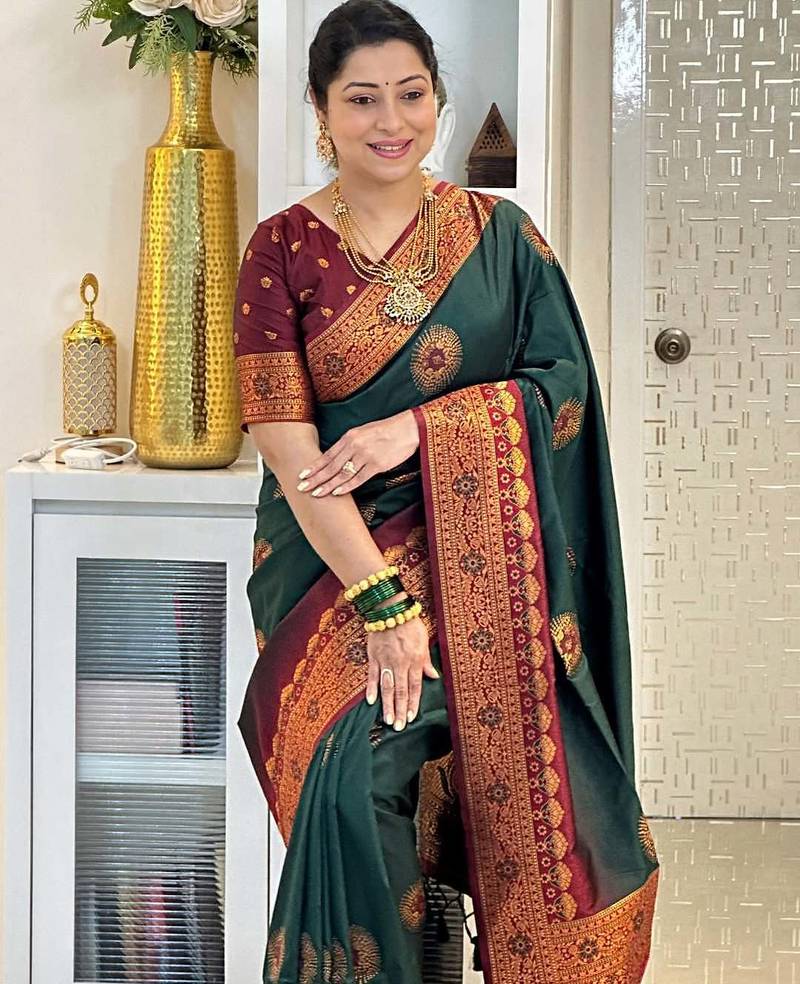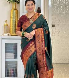 Green maroon soft art silk blend banarasi jacuard work designer party wear saree with unstitched blouse piece