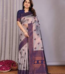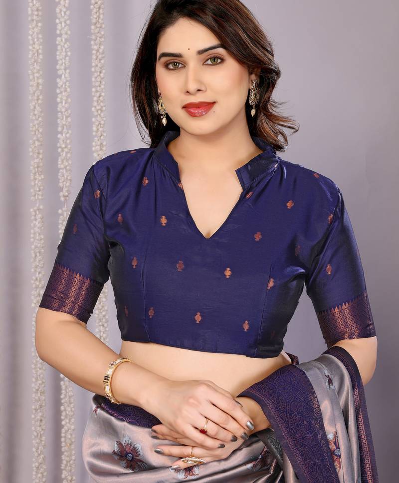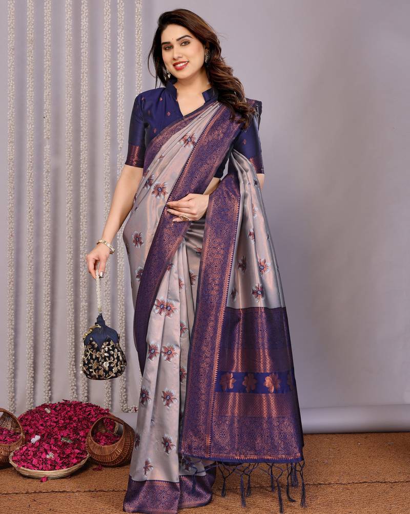 Grey neavy blue soft art silk blend banarasi jacuard work designer party wear saree with unstitched blouse piece
