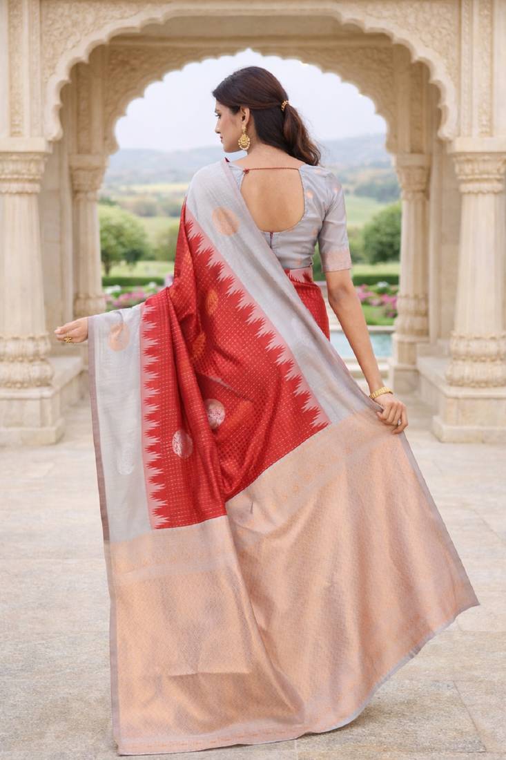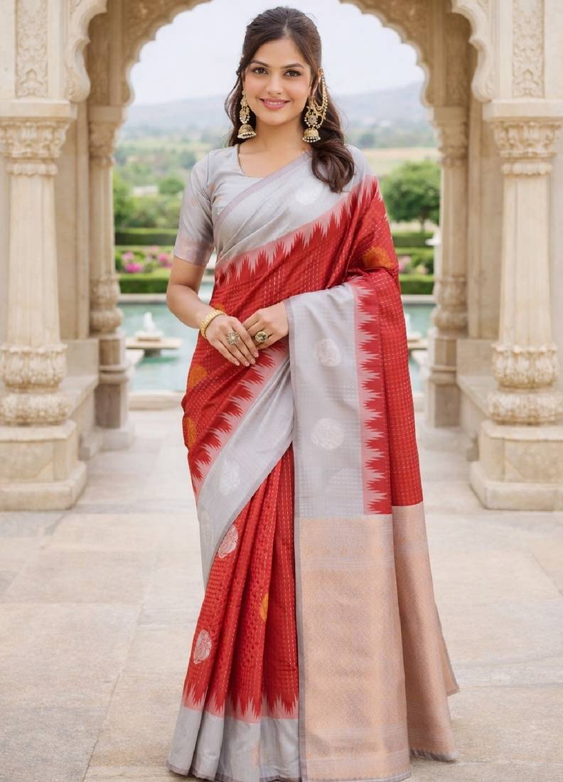 | Product Name | Grey Red Silk Blend Jacuard Work Designer Party Wear Saree With Unstitched Blouse Piece | |