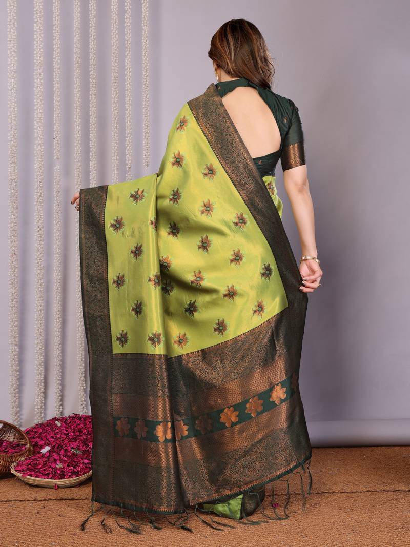 Lemon green soft art silk blend banarasi jacuard work designer party wear saree with unstitched blouse piece