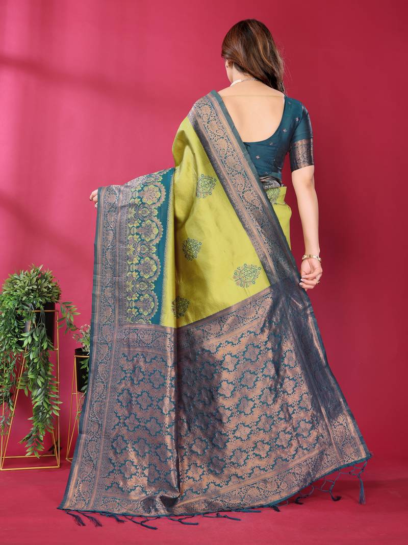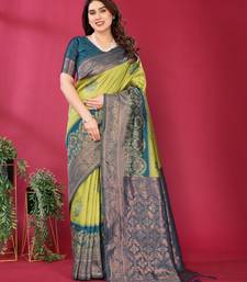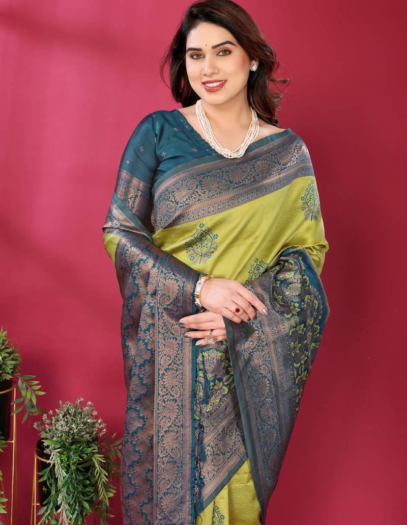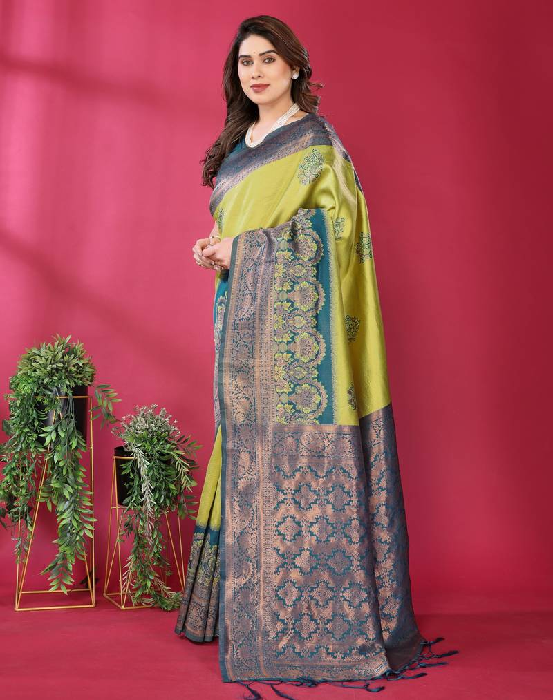 Lemon morpich soft art silk blend banarasi jacuard work designer party wear saree with unstitched blouse piece