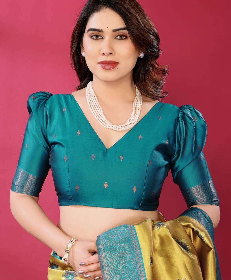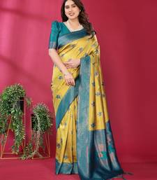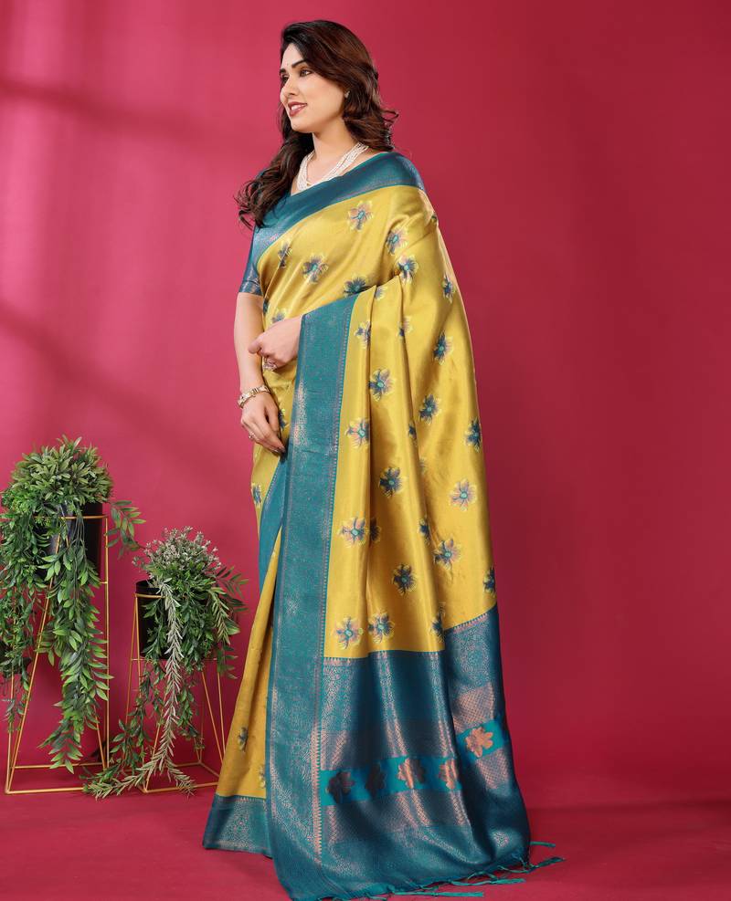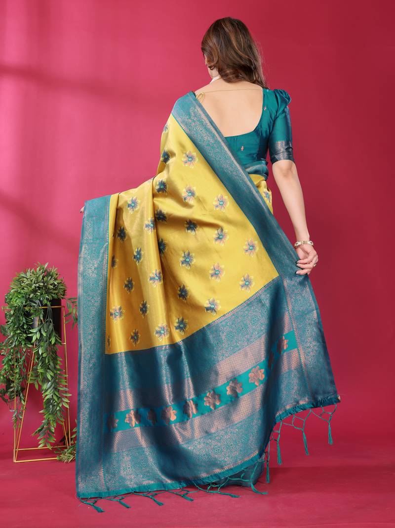 Lemon rama soft art silk blend banarasi jacuard work designer party wear saree with unstitched blouse piece