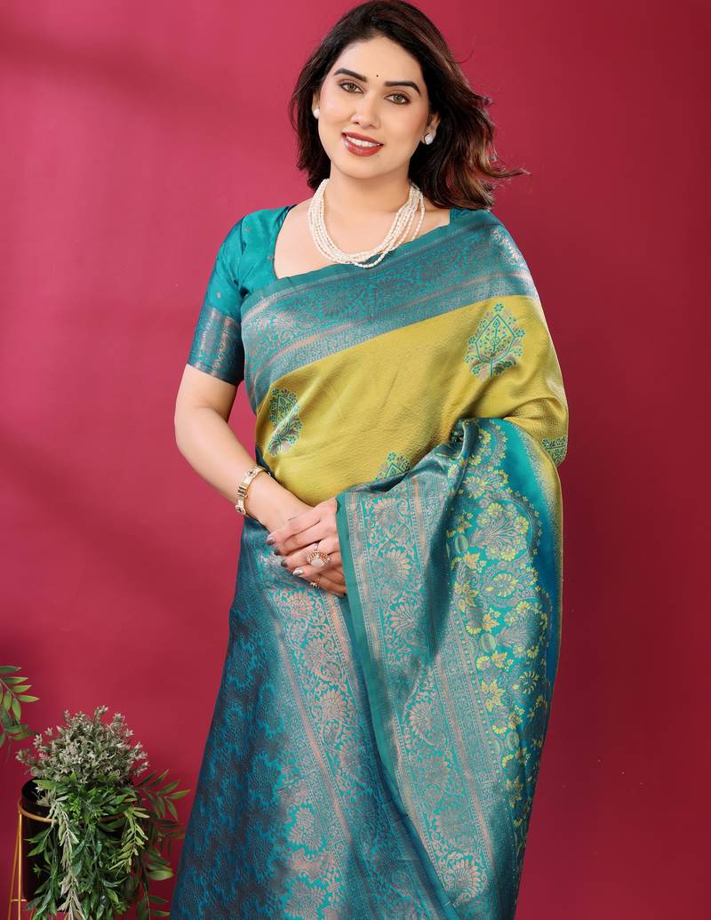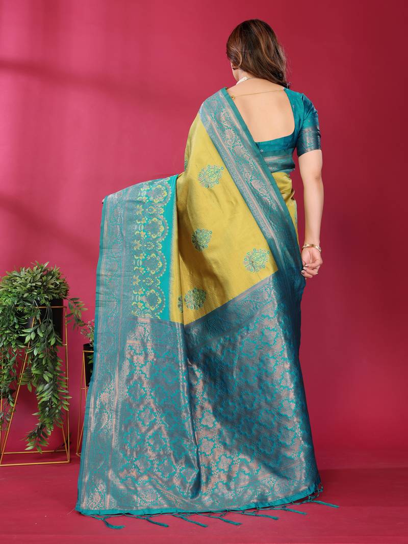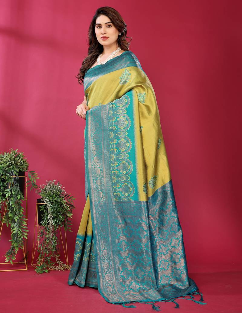 Lemon rama soft art silk blend banarasi jacuard work designer party wear saree with unstitched blouse piece