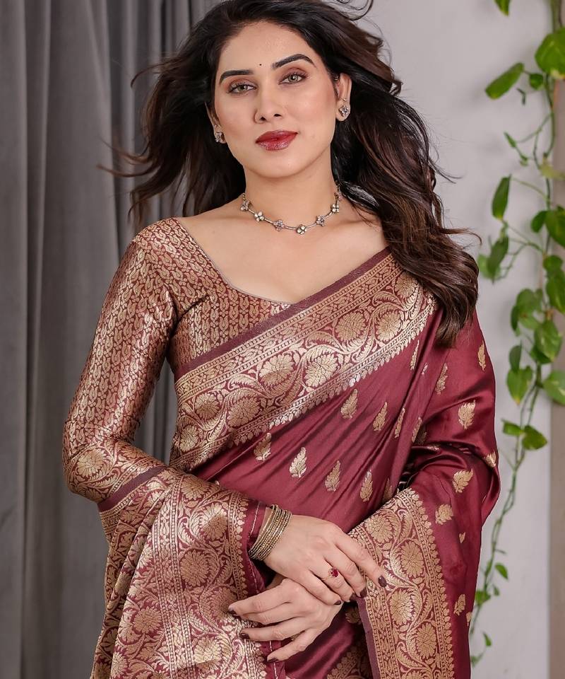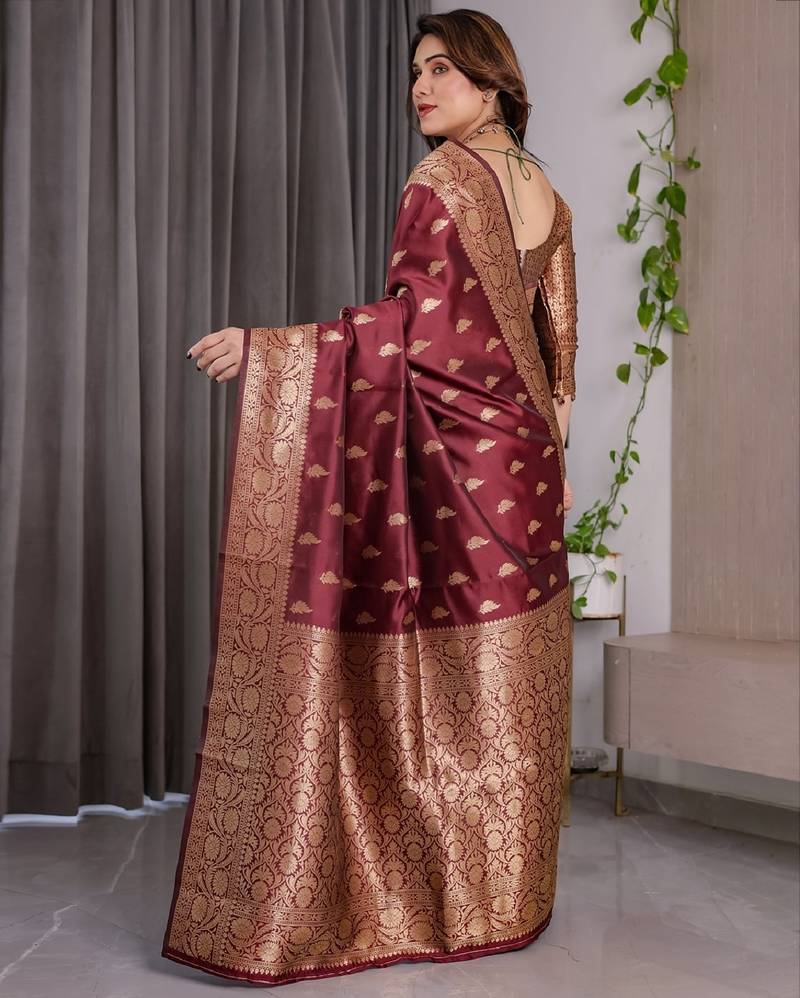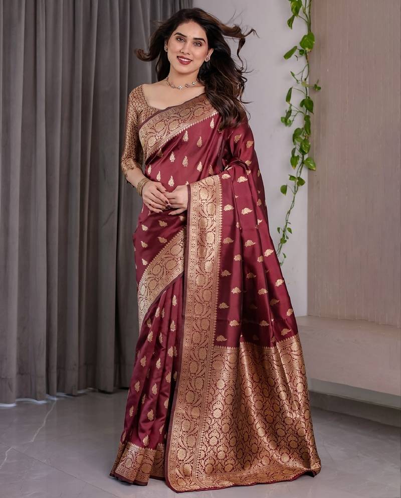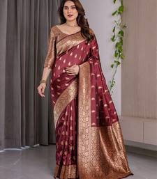 Maroon soft art silk banarasi jacuard work designer party wear saree with unstitched blouse piece