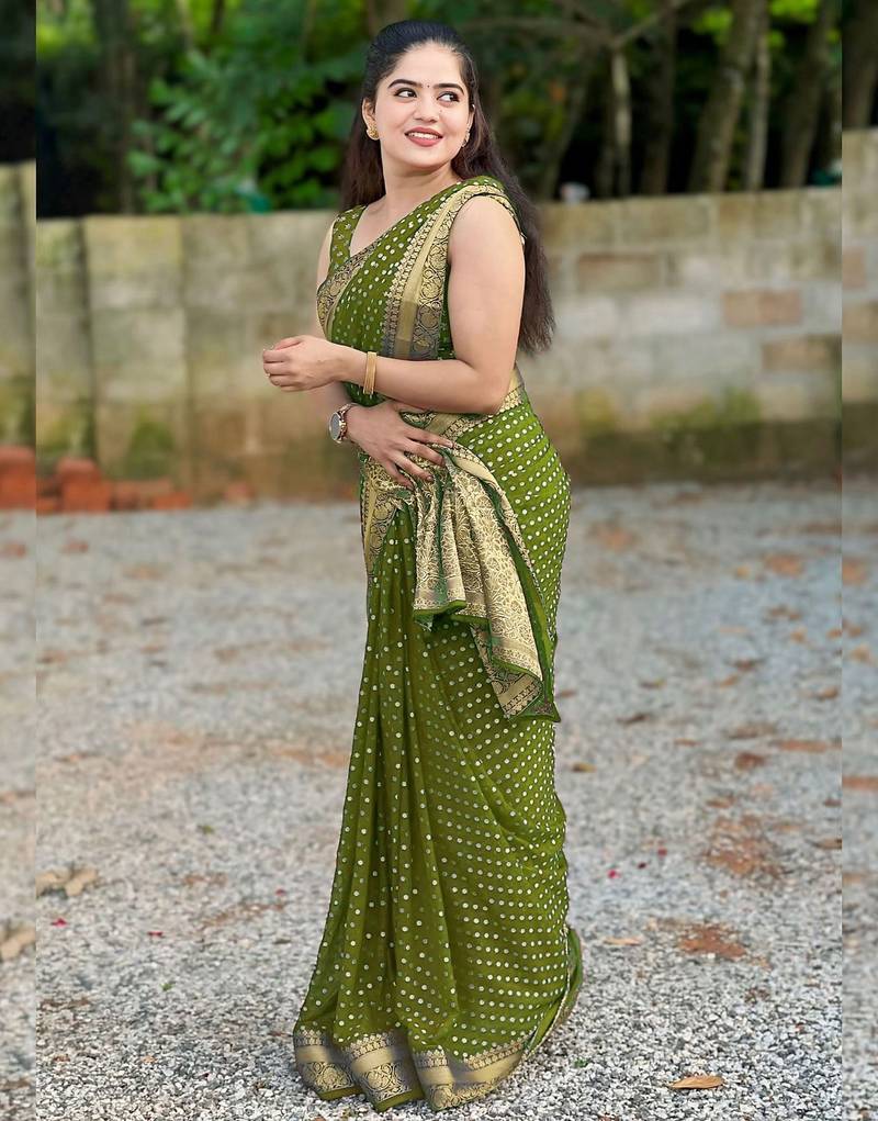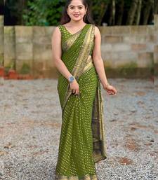 Mehendi soft silk blend banarasi jacuard work designer party wear saree with unstitched blouse piece