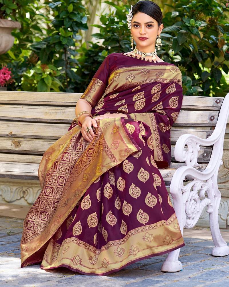 Purple soft silk blend banarasi jacuard work designer party wear saree with unstitched blouse piece
