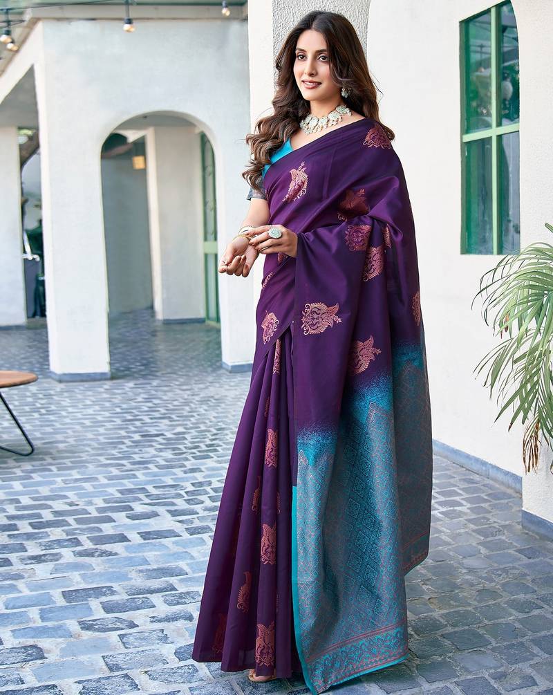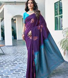Purple soft silk blend banarasi jacuard work designer party wear saree with unstitched blouse piece