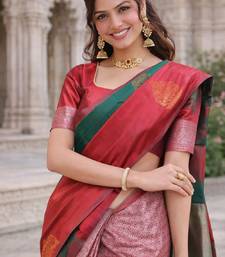 Red green silk blend jacuard work designer party wear saree with unstitched blouse piece