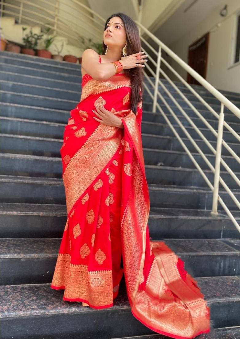 Red soft art silk banarasi jacuard work designer party wear saree with unstitched blouse piece